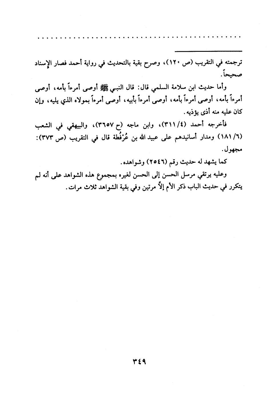 وعليه يرتقي مرسل الحسن إلى الحسن لغيره بمجموع هذه الشواهد على أنه لم يتكرر في حديث الباب ذكر الأم إلَّا مرتين وفي بقية الشواهد ثلاث مرات.