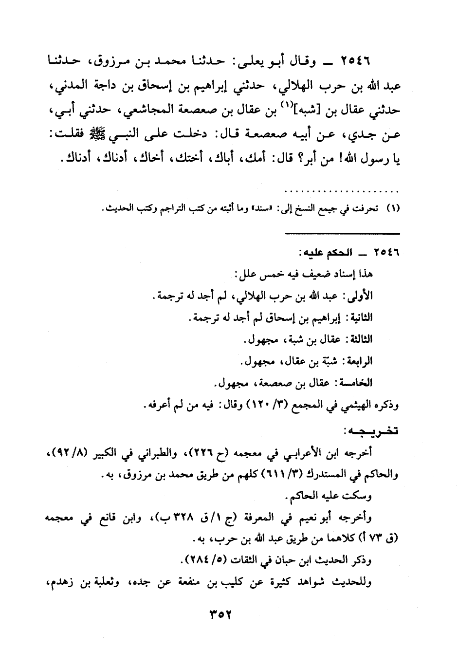 2546 - وَقَالَ أَبُو يَعْلَى: حَدَّثَنَا مُحَمَّدُ بْنُ مَرْزُوقٍ، حَدَّثَنَا عَبْدُ اللَّهِ بْنُ حَرْبٍ الْهِلَالِيُّ، حَدَّثَنِي إِبْرَاهِيمُ بْنُ إِسْحَاقَ بْنِ دَاجَةَ الْمَدَنِيُّ، حَدَّثَنِي عِقَالُ بْنُ [شَبَهٍ] بْنِ عِقَالِ بْنِ صَعْصَعَةَ الْمُجَاشِعِيُّ، حَدَّثَنِي أَبِي، عَنْ جَدِّي، عَنْ أَبِيهِ صَعْصَعَةَ قَالَ: دَخَلْتُ عَلَى النَّبِيِّ صَلَّى اللَّهُ عَلَيْهِ وَسَلَّمَ فَقُلْتُ: يَا رَسُولَ اللَّهِ! §مَنْ أَبَرُّ؟ قَالَ: أُمَّكَ، أَبَاكَ، أُخْتَكَ، أَخَاكَ، أَدْنَاكَ، أَدْنَاكَ.