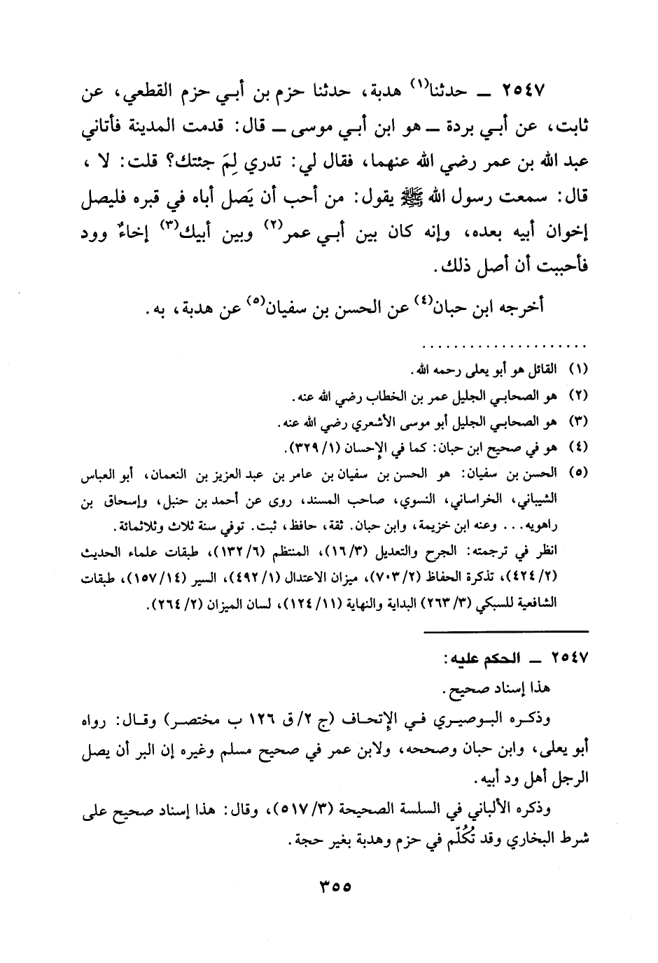 2547 - حَدَّثَنَا هُدْبَةُ، حَدَّثَنَا حَزْمُ بْنُ أَبِي حَزْمٍ الْقُطَعِيُّ، عَنْ ثَابِتٍ، عَنْ أَبِي بُرْدَةَ - هُوَ ابْنُ أَبِي مُوسَى - قَالَ قَدِمْتُ الْمَدِينَةَ فَأَتَانِي عَبْدُ اللَّهِ بْنُ عُمَرَ رَضِيَ الله عَنْهُمَا، فَقَالَ لِي: تَدْرِي لِمَ جِئْتُكَ؟ قُلْتُ: لَا، قَالَ: سَمِعْتُ رَسُولَ اللَّهِ صَلَّى اللَّهُ عَلَيْهِ وَسَلَّمَ يَقُولُ: §مَنْ أَحَبَّ أَنْ يَصِلَ أَبَاهُ فِي قَبْرِهِ فَلْيَصِلْ إِخْوَانَ أَبِيهِ بَعْدَهُ، وَإِنَّهُ كَانَ بَيْنَ أَبِي عُمَرَ وَبَيْنَ أَبِيكَ إِخَاءٌ وَوُدٌّ فَأَحْبَبْتُ أَنْ أَصِلَ ذَلِكَ. أَخْرَجَهُ ابْنُ حِبَّانَ عَنِ الْحَسَنِ بْنِ سُفْيَانَ عَنْ هُدْبَةَ، بِهِ.