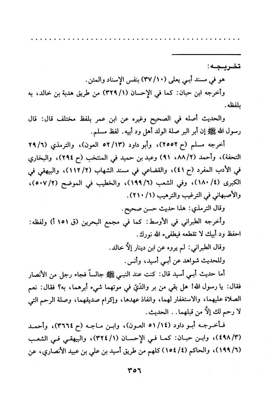 أما حديث أبي أسيد قَالَ: كُنْتُ عِنْدَ النَّبِيِّ -صَلَّى اللَّهُ عَلَيْهِ وسلم- جالسًا فجاء رَجُلٌ مِنَ الْأَنْصَارِ فَقَالَ: يَا رَسُولَ اللَّهِ! هل بقي من بر والدَيّ في موتهما شيء أبرهما، به؟ فقال: نعم الصلاة عليهما، والاستغفار لهما، وانفاذ عهدهما، وإكرام صديقهما، وصلة الرحم التي لا رحم لك إلَّا من قبلهما .. الحديث.