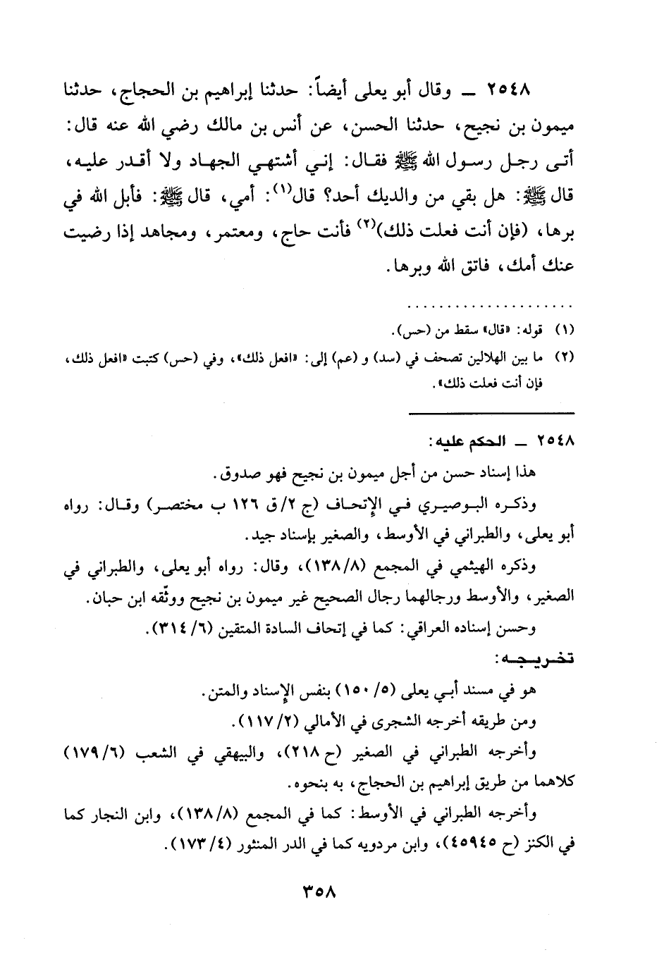 2548 - وَقَالَ أَبُو يَعْلَى أَيْضًا: حَدَّثَنَا إِبْرَاهِيمُ بْنُ الْحَجَّاجِ، حَدَّثَنَا مَيْمُونُ بْنُ نَجِيحٍ، حَدَّثَنَا الْحَسَنُ، عَنْ أَنَسِ بْنِ مَالِكٍ رَضِيَ الله عَنْهُ قَالَ: أَتَى رَجُلٌ رَسُولَ اللَّهِ صَلَّى اللَّهُ عَلَيْهِ وَسَلَّمَ فَقَالَ: إِنِّي أَشْتَهِي الْجِهَادَ وَلَا أَقْدِرُ عَلَيْهِ، قَالَ صَلَّى اللَّهُ عَلَيْهِ وَسَلَّمَ: §هَلْ بَقِيَ مِنْ وَالِدَيْكَ أَحَدٌ؟ قَالَ: أُمِّي، قَالَ صَلَّى اللَّهُ عَلَيْهِ وَسَلَّمَ: فَأَبْلِ اللَّهَ فِي بِرِّهَا، (فَإِنْ أَنْتَ فَعَلْتَ ذَلِكَ) فَأَنْتَ حَاجٌّ، وَمُعْتَمِرٌ، وَمُجَاهِدٌ إِذَا رَضِيَتْ عَنْكَ أُمُّكَ، فَاتَّقِ اللَّهَ وَبِرَّهَا.