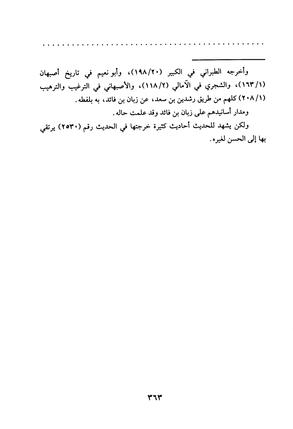 = وأخرجه الطبراني في الكبير (20/ 198)، وأبو نعيم في تاريخ أصبهان (1/ 163)، والشجري في الآمالي (2/ 118)، والأصبهاني في الترغيب والترهيب (1/ 208) كلهم من طريق رشدين بن سعد، عن زبان بن فائد، به بلفطه.
