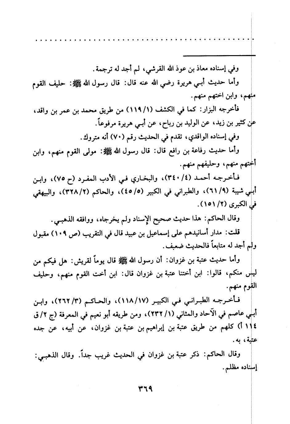 وأما حديث عتبة بن غزوان: أن رسول الله -صلى الله عليه وسلم- قال يومًا لقريش: هل فيكم من ليس منكم، قالوا: ابن أختنا عتبة بن غزوان قال: ابن أخت القوم منهم، وحليف القوم منهم.
