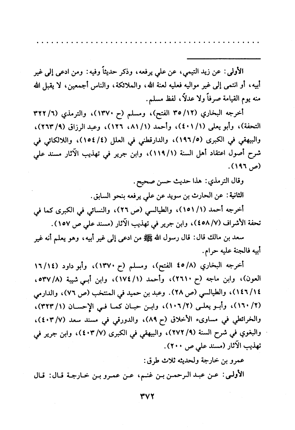 = الأولى: عن زيد التيمي، عن علي يرفعه، وذكر حديثًا وفيه: ومن ادَّعَى إِلَى غَيْرِ أَبِيهِ، أَوِ انْتَمَى إِلَى غير مواليه فَعَلَيْهِ لَعْنَةُ اللَّهِ، وَالْمَلَائِكَةِ، وَالنَّاسِ أَجْمَعِينَ، لَا يقبل الله منه يوم القيامة صرفًا ولا عدلًا، لفظ مسلم.