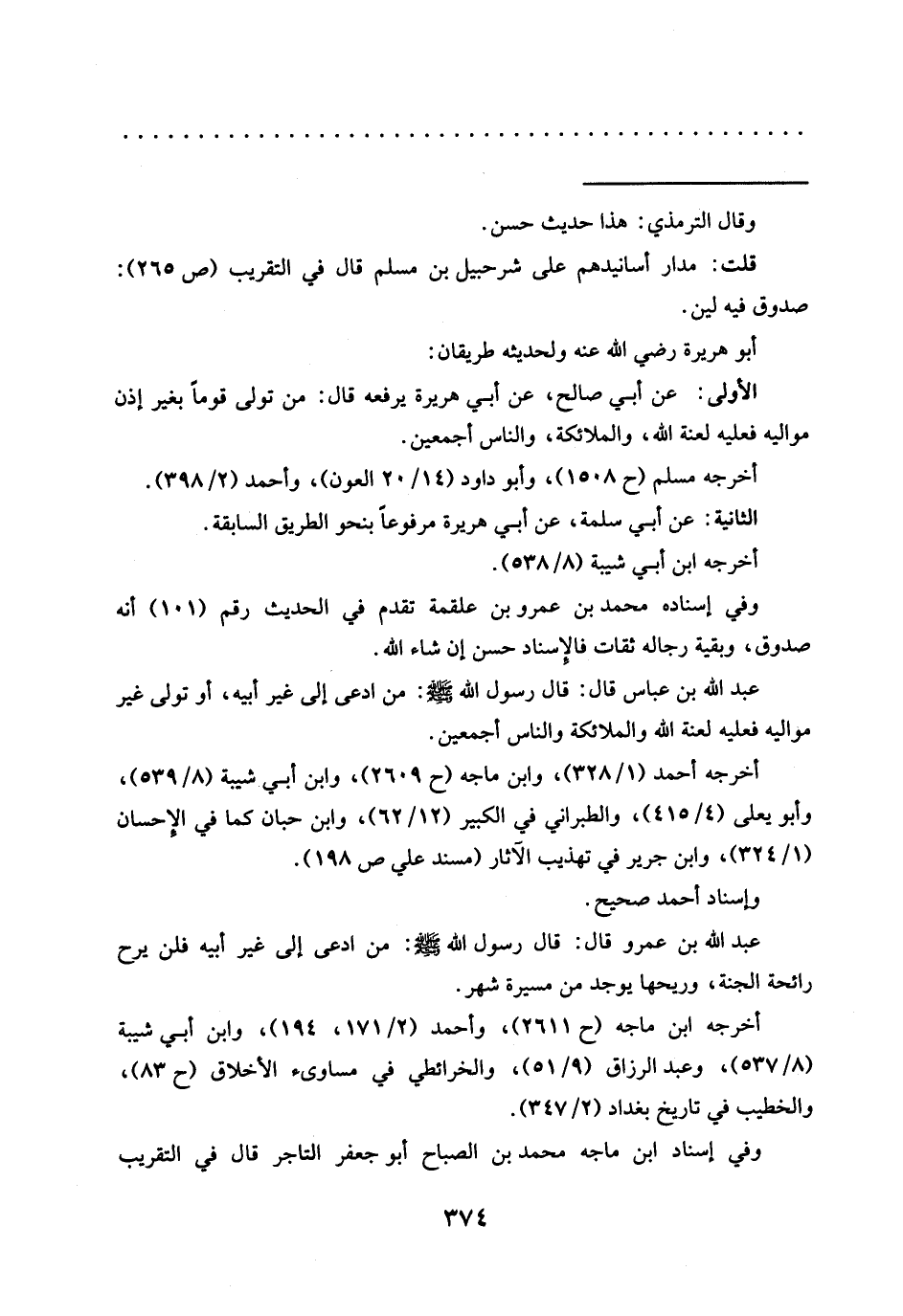 عبد الله بن عَبَّاسٍ قَالَ: قَالَ رَسُولُ اللَّهِ -صَلَّى اللَّهُ عَلَيْهِ وَسَلَّمَ-: مَنِ ادَّعَى إِلَى غَيْرِ أَبِيهِ، أو تولى غير مواليه فعليه لعنة الله والملائكة والناس أجمعين.