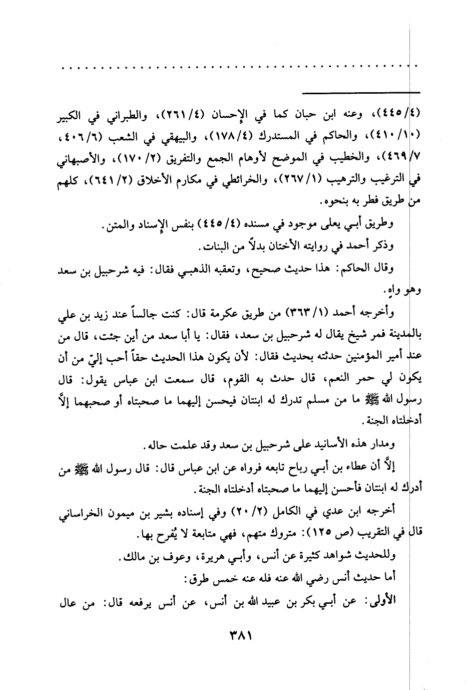 وأخرجه أحمد (1/ 363) من طريق عكرمة قال: كنت جالسًا عند زيد بن علي بالمدينة فمر شيخ يقال له شرحبيل بن سعد، فقال: يا أبا سعد من أين جئت، قال من عندي أمير المؤمنين حدثته بحديث فقال: لأن يكون هذا الحديث حقًا أحب إليّ من أن يكون لي حمر النعم، قال حدث به القوم، قال سمعت ابْنَ عَبَّاسٍ يَقُولُ: قَالَ رَسُولُ اللَّهِ -صَلَّى الله عليه وسلم- ما من مسلم تدرك له ابنتان فيحسن إليهما ما صحبتاه أو صحبهما إلَّا أدخلتاه الجنة.