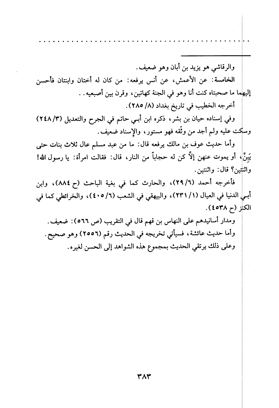 وأما حديث عوف بن مالك يرفعه قال: ما من عبد مسلم عال ثلاث بنات حتى يَبِنَّ، أو يموت عنهن إلَّا كن له حجابًا من النار، قال: فقالت امرأة: يا رسول الله! واثنتين؟ قال: واثنتين.