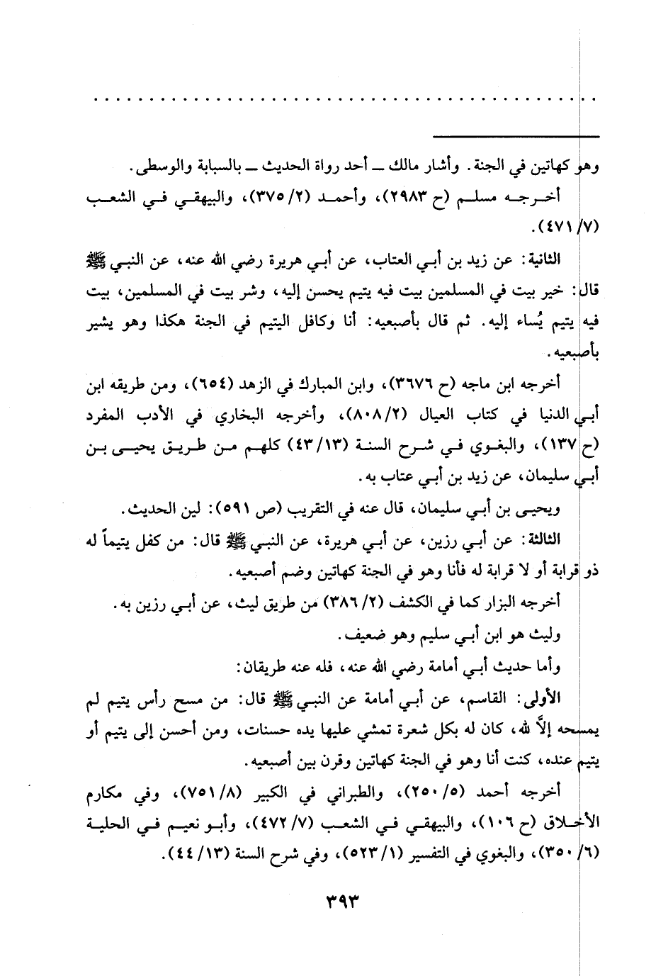 الثانية: عن زيد بن أبي العتاب، عَنْ أَبِي هُرَيْرَةَ رَضِيَ اللَّهُ عَنْهُ، عَنِ النَّبِيِّ -صَلَّى اللَّهُ عَلَيْهِ وَسَلَّمَ- قَالَ: خير بيت في المسلمين بيت فيه يتيم يحسن إليه، وشر بيت في المسلمين، بيت فيه يتيم يُساء إليه. ثم قال بأصبعيه: أنا وكافل اليتيم في الجنة هكذا وهو يشير بأصبعيه.