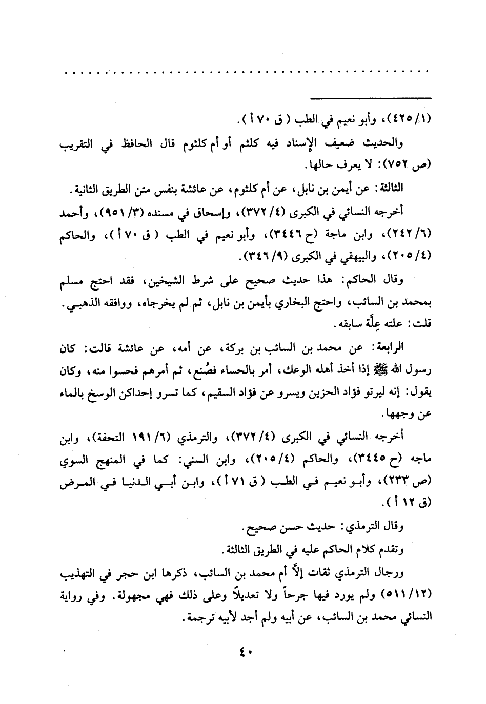 أخرجه النسائي في الكبرى (4/ 372)، وإسحاق في مسنده (3/ 951)، وأحمد (6/ 242)، وابن ماجة (ح 3446)، وأبو نعيم في الطب (ق 70 أ)، والحاكم (4/ 205)، والبيهقي في الكبرى (9/ 346).