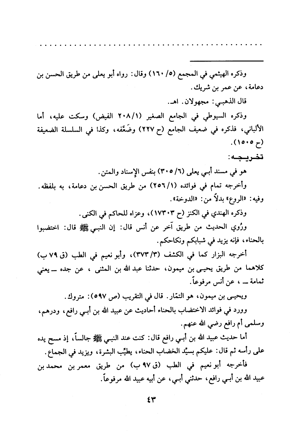 وورد في فوائد الاختضاب بالحناء أحاديث عن عبيد الله بن أبي رافع، ودرهم، وسلمى أم رافع رضي الله عنهم.