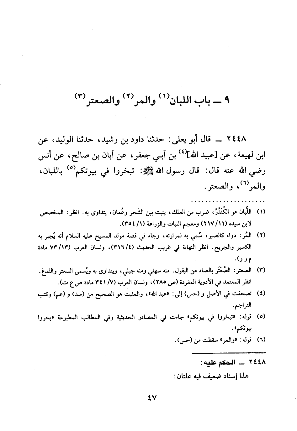 2448 - قَالَ أَبُو يَعْلَى: حَدَّثَنَا دَاوُدُ بْنُ رُشَيْدٍ، حَدَّثَنَا الْوَلِيدُ، عَنِ ابْنِ لَهِيعَةَ، عَنْ [عُبَيْدِ اللَّهِ] بْنِ أَبِي جَعْفَرٍ، عَنْ أَبَانَ بْنِ صَالِحٍ، عَنْ أَنَسٍ رَضِيَ الله عَنْهُ قَالَ: قَالَ رَسُولُ اللَّهِ صَلَّى اللَّهُ عَلَيْهِ وَسَلَّمَ: §تَبَخَّرُوا فِي بُيُوتِكُمْ بِاللُّبَانِ، وَالْمُرِّ، وَالصَّعْتَرِ.
