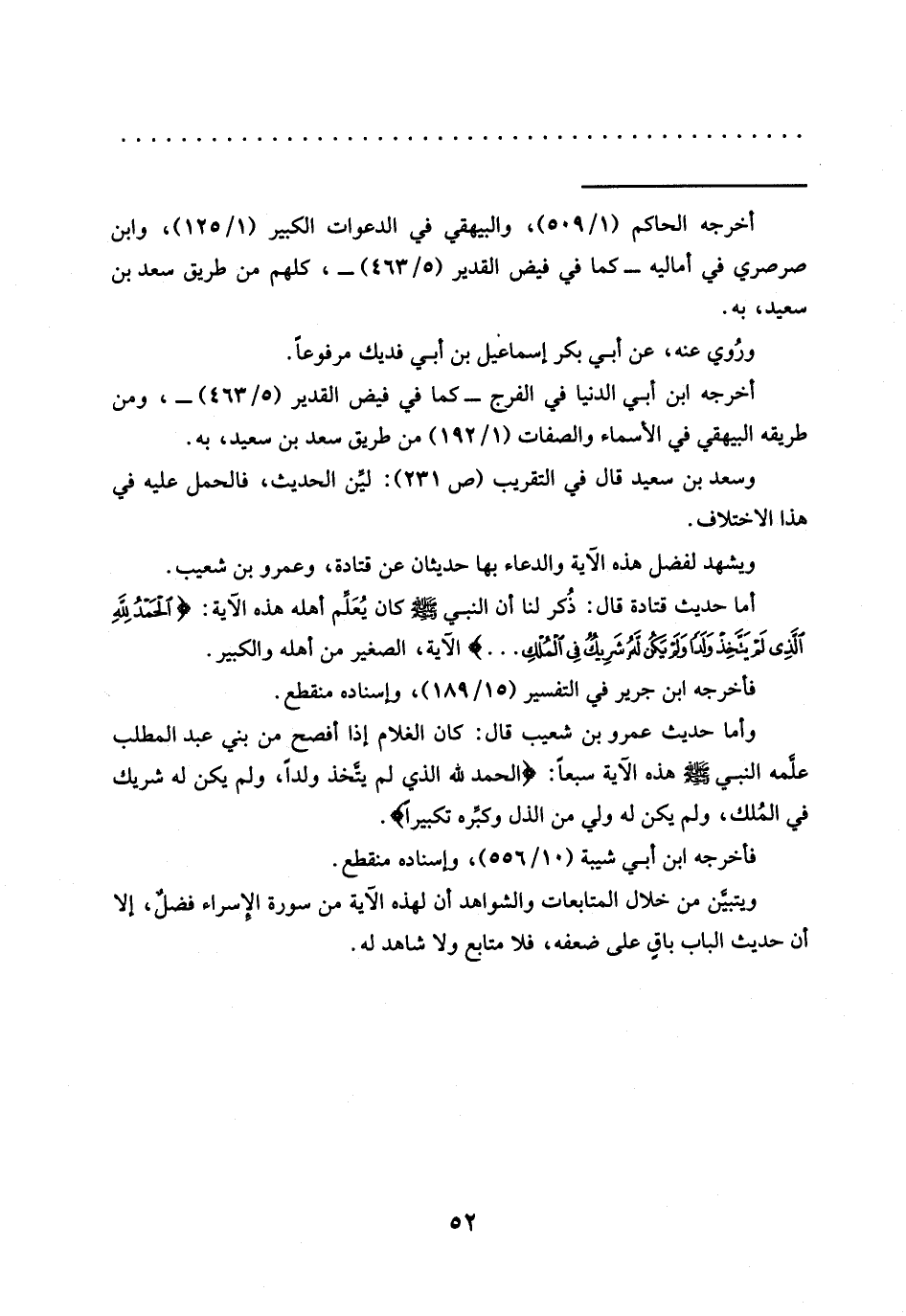 وأما حديث عمرو بن شعيب قال: كان الغلام إذا أفصح من بني عبد المطلب علَّمه النبي -صلى الله عليه وسلم- هذه الآية سبعًا: {الْحَمْدُ لِلَّهِ الَّذِي لَمْ يَتَّخِذْ وَلَدًا وَلَمْ يَكُنْ لَهُ شَرِيكٌ فِي الْمُلْكِ وَلَمْ يَكُنْ لَهُ وَلِيٌّ مِنَ الذُّلِّ وَكَبِّرْهُ تَكْبِيرًا}.