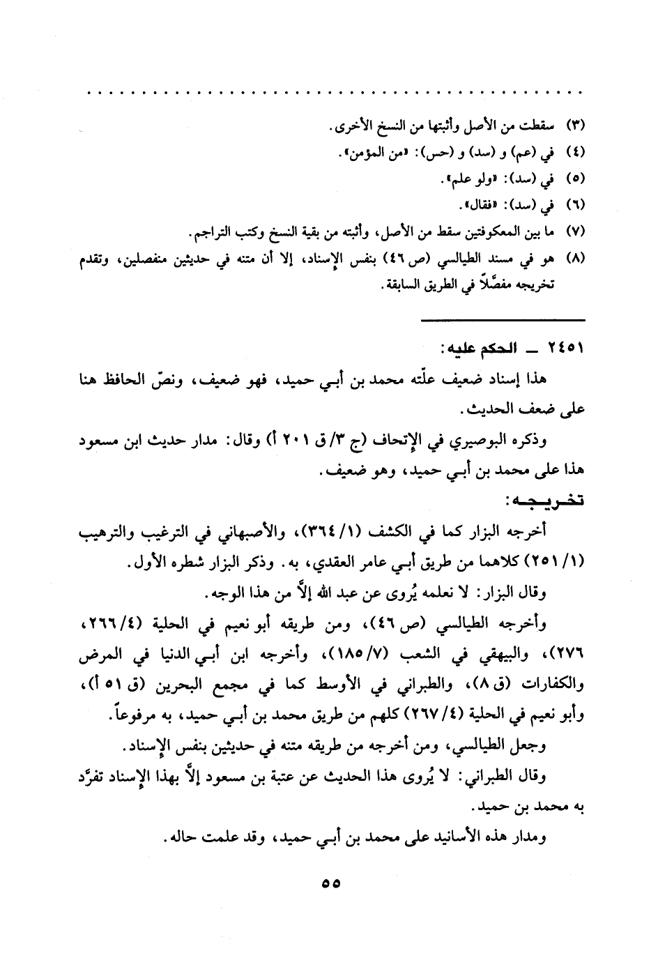 وذكره البوصيري في الإتحاف (ج 3/ ق 201 أ) وقال: مدار حديث ابن مسعود هذا على محمد بن أبي حميد، وهو ضعيف.