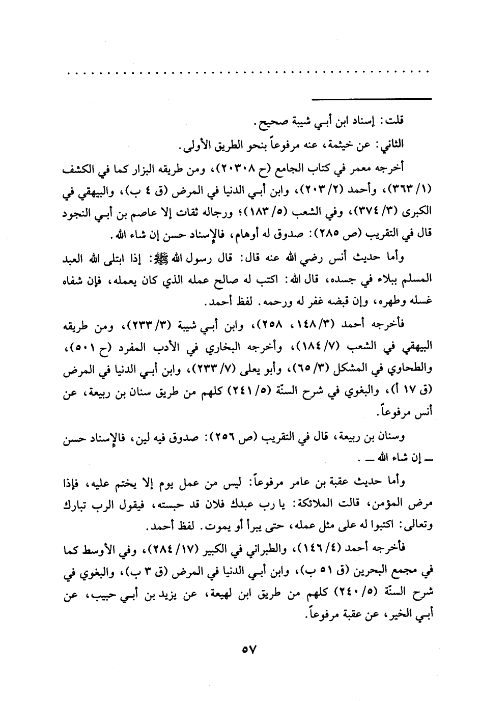 وأما حديث عقبة بن عامر مرفوعًا: ليس من عمل يوم إلا يختم عليه، فإذا مرض المؤمن، قالت الملائكة: يا رب عبدك فلان قد حبسته، فيقول الرب تبارك وتعالى: اكتبوا له على مثل عمله، حتى يبرأ أو يموت. لفظ أحمد.
