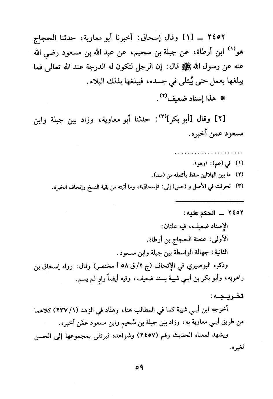 2452 -[1] وَقَالَ إِسْحَاقُ: أَخْبَرَنَا أَبُو مُعَاوِيَةَ، حَدَّثَنَا الْحَجَّاجُ هُوَ ابْنُ أَرْطَاةَ، عَنْ جَبَلَةَ بْنِ سُحَيْمٍ، عَنْ عَبْدِ اللَّهِ بْنِ مَسْعُودٍ رَضِيَ الله عَنْهُ عَنْ رَسُولِ اللَّهِ صَلَّى اللَّهُ عَلَيْهِ وَسَلَّمَ قَالَ: §إِنَّ الرَّجُلَ لَتَكُونُ لَهُ الدَّرَجَةُ عِنْدَ اللَّهِ تَعَالَى فَمَا يَبْلُغُهَا بِعَمَلٍ حَتَّى يُبْتَلَى فِي جَسَدِهِ، فَيَبْلُغُهَا بِذَلِكَ الْبَلَاءِ.
