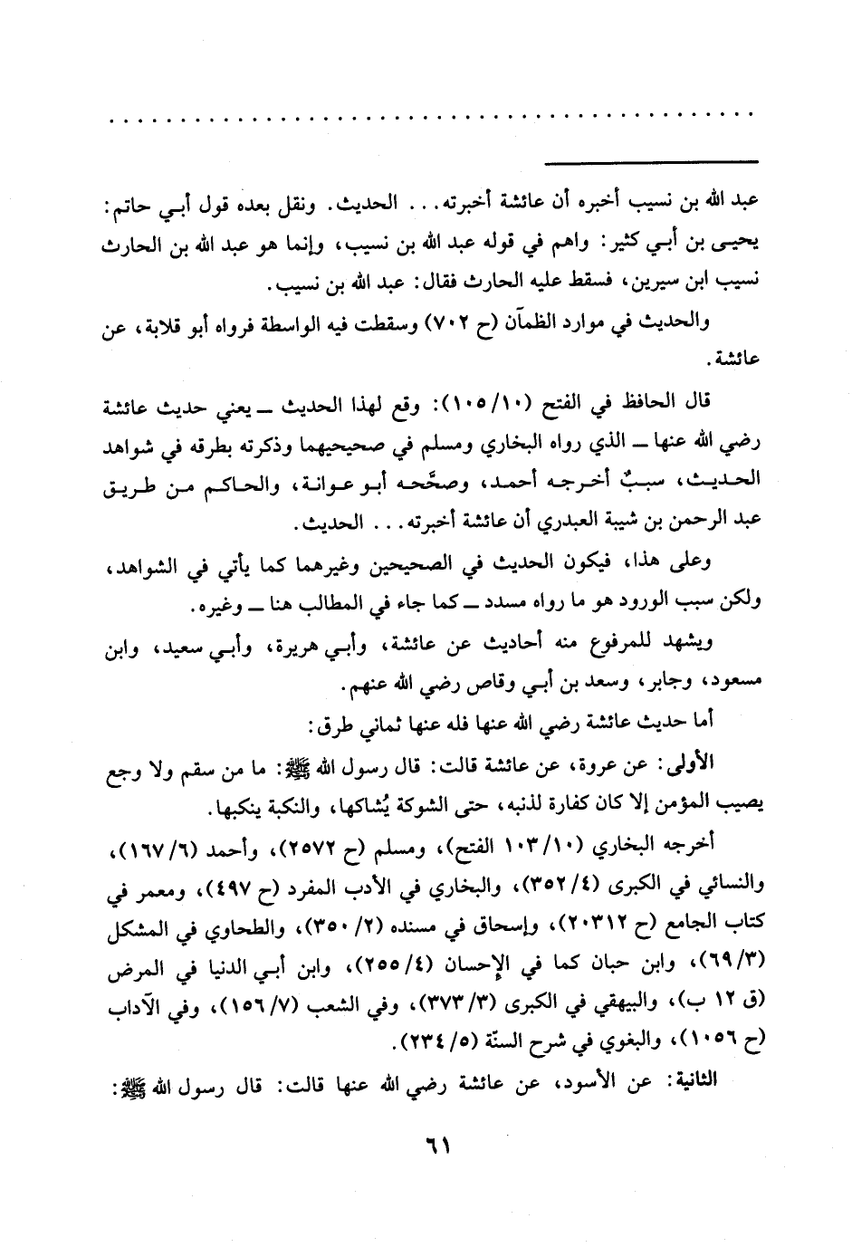 الأولى: عَنْ عُرْوَةَ، عَنْ عَائِشَةَ قَالَتْ: قَالَ رَسُولُ اللَّهِ-صَلَّى اللَّهُ عَلَيْهِ وَسَلَّمَ-: مَا مِنْ سقم ولا وجع يصيب المؤمن إلا كان كفارة لذنبه، حتى الشوكة يُشاكها، والنكبة ينكبها.