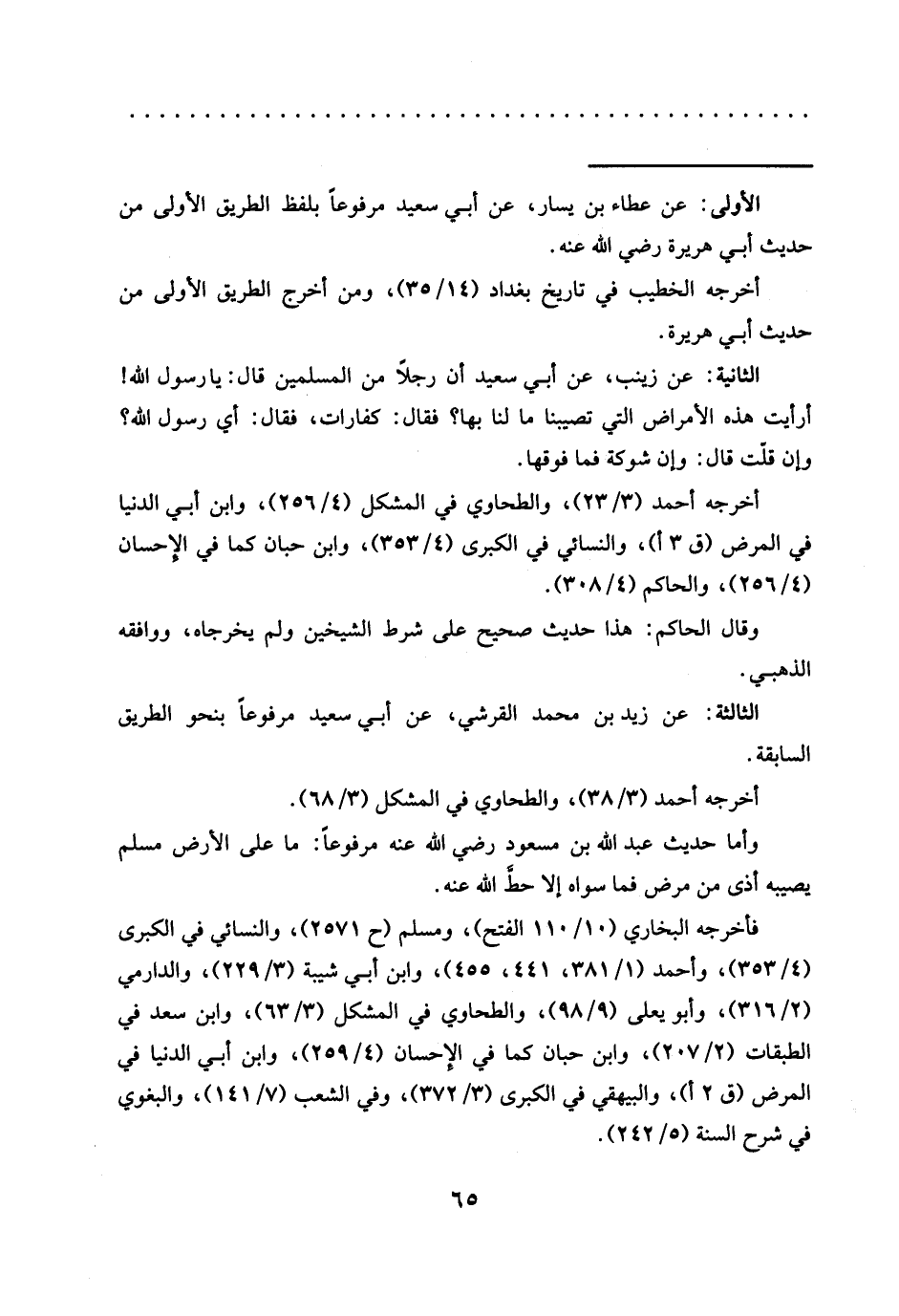 الثانية: عن زينب، عن أبي سعيد أن رجلًا من المسلمين قال: يا رسول الله! أرأيت هذه الأمراض التي تصيبنا ما لنا بها؟ فقال: كفارات، فقال: أي رسول الله؟ وإن قلّت قال: وإن شوكة فما فوقها.