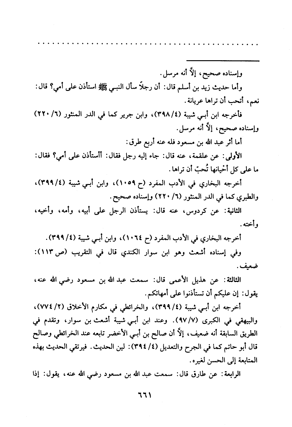 الثالثة: عن هذيل الأعمى قال: سَمِعْتُ عَبْدَ اللَّهِ بْنَ مَسْعُودٍ رَضِيَ اللَّهُ عَنْهُ، يقول: ان عليكم أن تستأذنوا على أمهاتكم.