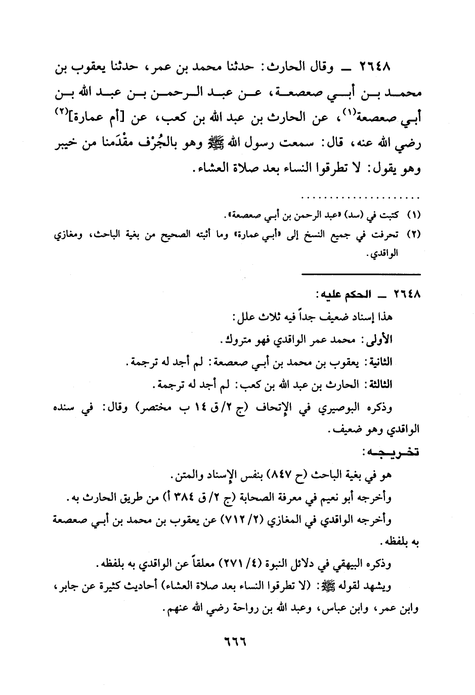2648 - وَقَالَ الْحَارِثُ: حَدَّثَنَا مُحَمَّدُ بْنُ عُمَرَ، حَدَّثَنَا يَعْقُوبُ بْنُ مُحَمَّدِ بْنِ أَبِي صَعْصَعَةَ، عَنْ عَبْدِ الرَّحْمَنِ بْنِ عَبْدِ اللَّهِ بْنِ أَبِي صَعْصَعَةَ، عَنِ الْحَارِثِ بْنِ عَبْدِ اللَّهِ بْنِ كَعْبٍ، عَنْ [أُمِّ عُمَارَةَ] رَضِيَ الله عَنْهُ، قَالَ: سَمِعْتُ رَسُولَ اللَّهِ صَلَّى اللَّهُ عَلَيْهِ وَسَلَّمَ وَهُوَ بِالْجُرْفِ مَقْدَمَنَا مِنْ خَيْبَرَ وَهُوَ يَقُولُ: §لَا تَطْرُقُوا النِّسَاءَ بَعْدَ صَلَاةِ الْعِشَاءِ.