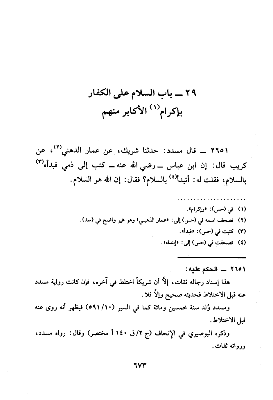 2651 - قَالَ مُسَدَّدٌ: حَدَّثَنَا شَرِيكٌ، عَنْ عَمَّارٍ الدُّهْنِيِّ، عَنْ كُرَيْبٍ قَالَ: إِنَّ ابْنَ عَبَّاسٍ - رَضِيَ الله عَنْهُ - §كَتَبَ إِلَى ذِمِّيٍّ فَبَدَأَهُ بِالسَّلَامِ، فَقُلْتُ لَهُ: أَتَبْدَأُ بِالسَّلَامِ؟ فَقَالَ: إِنَّ اللَّهَ هُوَ السَّلَامُ.