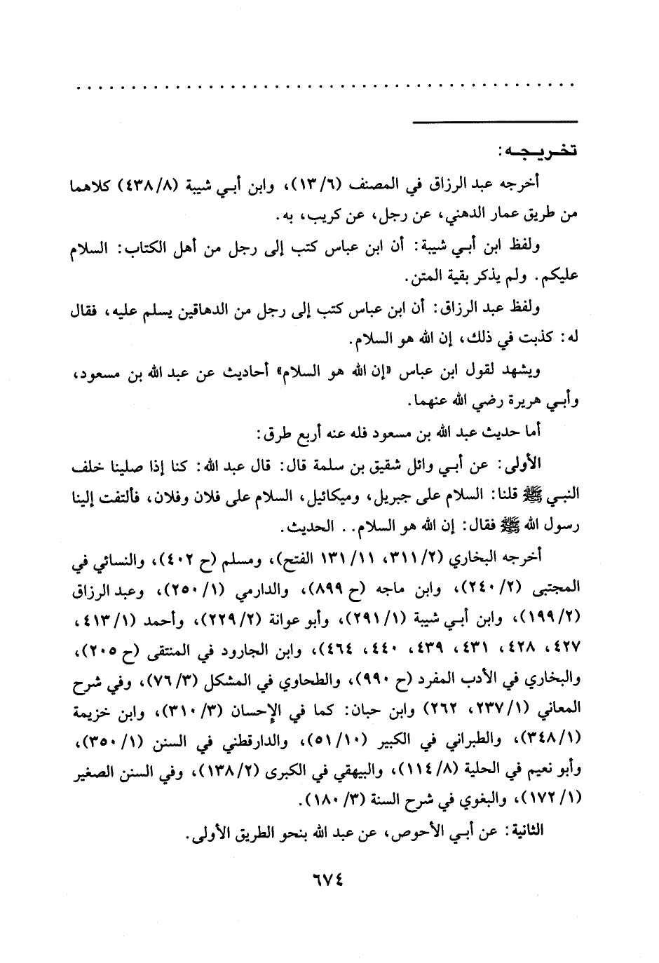 الأولى: عن أبي وائل شقيق بن سلمة قال: قال عبد الله: كنا إذا صلينا خلف النبي -صلى الله عليه وسلم- قلنا: السلام على جبريل، وميكائيل، السلام على فلان وفلان، فألتفت إِلَيْنَا رَسُولُ اللَّهِ -صَلَّى اللَّهُ عَلَيْهِ وَسَلَّمَ- فقال: إن الله هو السلام .. الحديث.