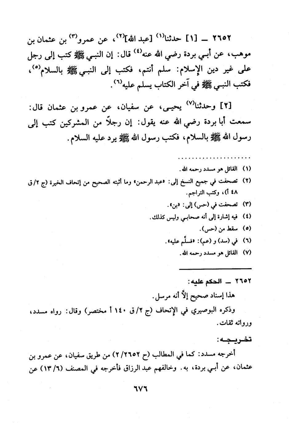 2652 -[1] حَدَّثَنَا [عَبْدُ اللَّهِ] ، عَنْ عَمْرِو بْنِ عُثْمَانَ بْنِ مَوْهَبٍ، عَنْ أَبِي بُرْدَةَ رَضِيَ الله عَنْهُ قَالَ: إنَّ النَّبِيَّ صَلَّى اللَّهُ عَلَيْهِ وَسَلَّمَ §كَتَبَ إِلَى رَجُلٍ عَلَى غَيْرِ دِينِ الْإِسْلَامِ: سَلْمٌ أَنْتُمْ، فَكَتَبَ إِلَى النَّبِيِّ صَلَّى اللَّهُ عَلَيْهِ وَسَلَّمَ بِالسَّلَامِ، فَكَتَبَ النَّبِيُّ صَلَّى اللَّهُ عَلَيْهِ وَسَلَّمَ فِي آخِرِ الْكِتَابِ يُسَلِّمُ عَلَيْهِ.