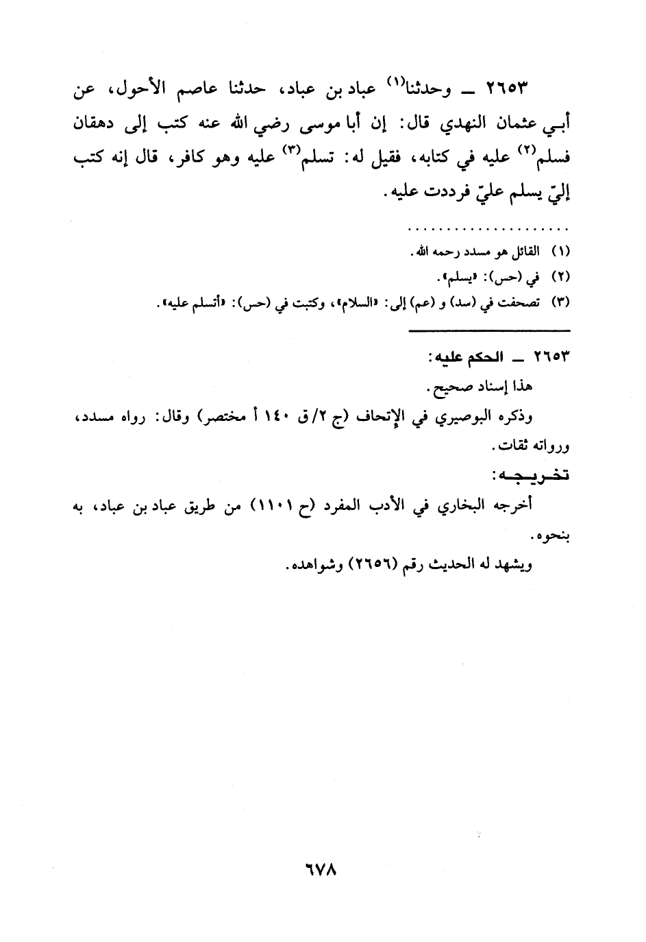 2653 - وَحَدَّثَنَا عَبَّادُ بْنُ عَبَّادٍ، حَدَّثَنَا عَاصِمٌ الْأَحْوَلُ، عَنْ أَبِي عُثْمَانَ النَّهْديُّ قَالَ: إِنَّ أَبَا مُوسَى رَضِيَ الله عَنْهُ §كَتَبَ إِلَى دِهْقَانٍ فَسَلَّمَ عَلَيْهِ فِي كِتَابِهِ، فَقِيلَ لَهُ: تُسَلِّمُ عَلَيْهِ وَهُوَ كَافِرٌ، قَالَ إِنَّهُ كَتَبَ إِلَيَّ يُسَلِّمُ عَلَيَّ فَرَدَدْتُ عَلَيْهِ.