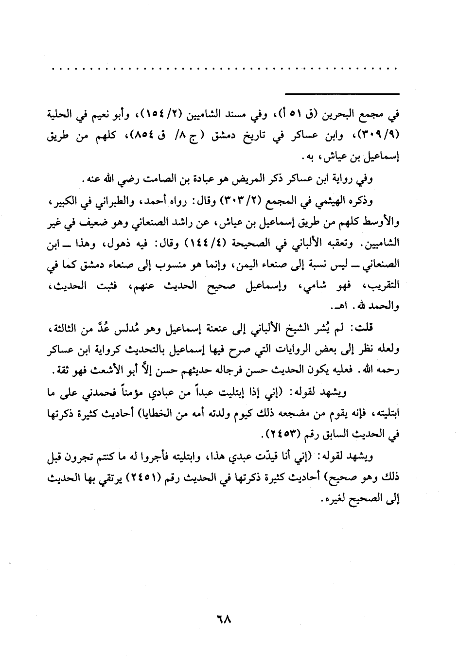 وذكره الهيثمي في المجمع (2/ 303) وقال: رواه أحمد، والطبراني في الكبير، والأوسط كلهم من طريق إسماعيل بن عياش، عن راشد الصنعاني وهو ضعيف في غير الشاميين. وتعقبه الألباني في الصحيحة (4/ 144) وقال: فيه ذهول، وهذا -ابن الصنعاني- ليس نسبة إلى صنعاء اليمن، وإنما هو منسوب إلى صنعاء دمشق كما في التقريب، فهو شامي، وإسماعيل صحيح الحديث عنهم، فثبت الحديث، والحمد لله. اهـ.