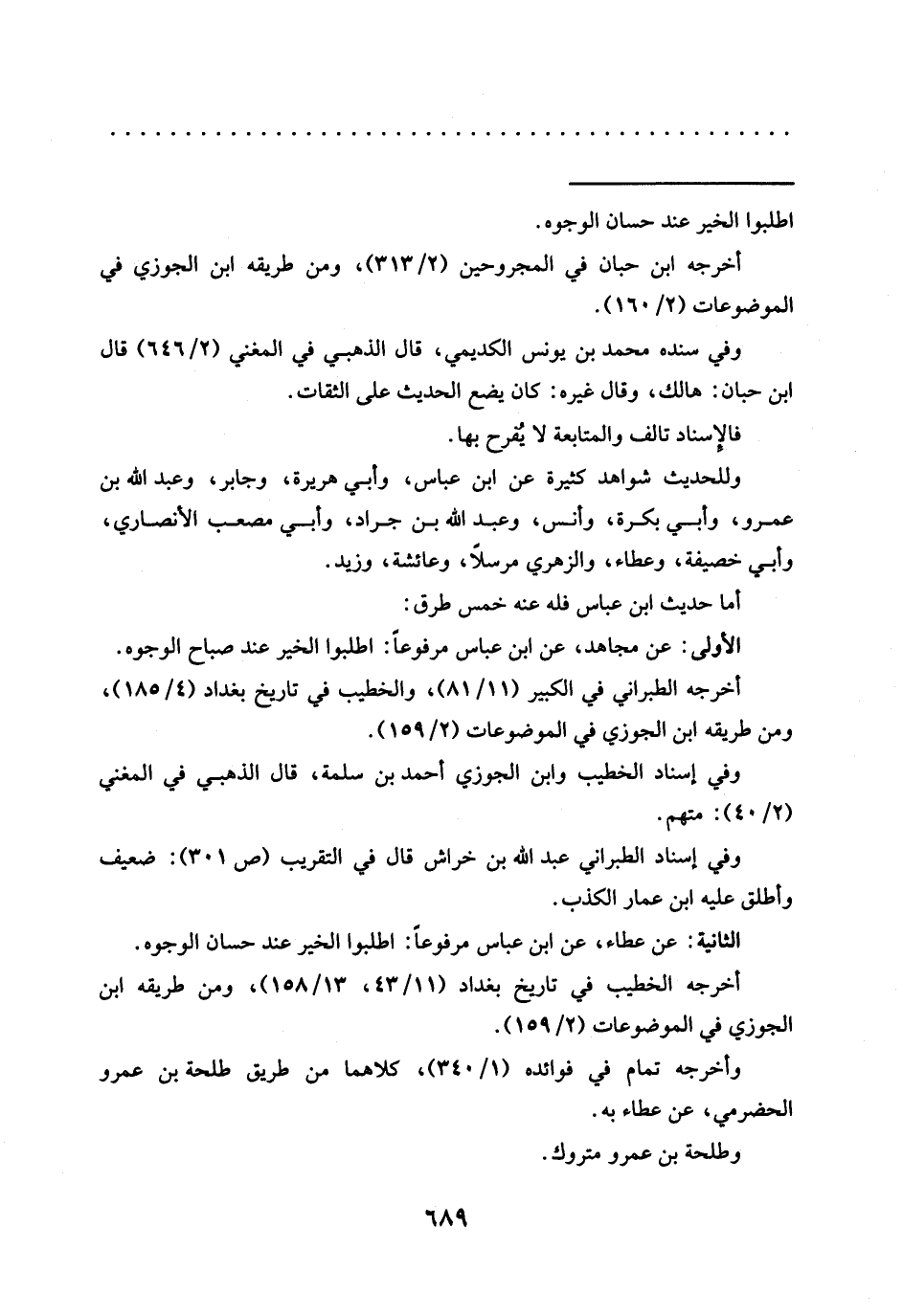 الثانية: عن عطاء، عن ابن عباس مرفوعًا: اطلبوا الخير عند حسان الوجوه.