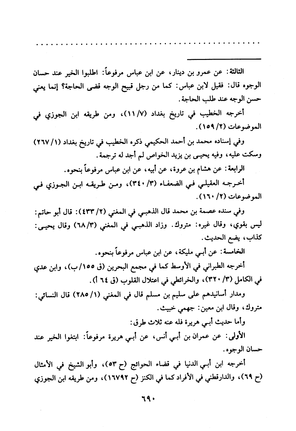 = الثالثة: عَنْ عَمْرِو بْنِ دِينَارٍ، عَنِ ابْنِ عَبَّاسٍ مرفوعًا: اطلبوا الخير عند حسان الوجوه قال: فقيل لابن عباس: كم من رجل قبيح الوجه قضى الحاجة؟ إنما يعني حسن الوجه عند طلب الحاجة.
