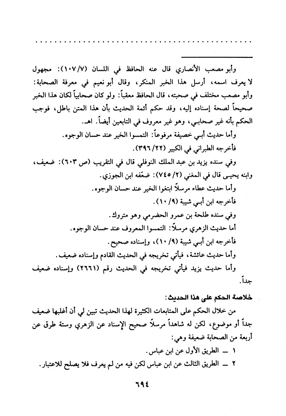 = وأبو مصعب الأنصاري قال عنه الحافظ في اللسان (7/ 107): مجهول لا يعرف اسمه، أرسل هذا الخبر المنكر، وقال أبو نعيم في معرفة الصحابة: وأبو مصعب مختلف في صحبته، قال الحافظ معقبًا: ولوكان صحابيًا لكان هذا الخبر صحيحًا لصحة إسناده إليه، وقد حكم أئمة الحديث بان هذا المتن باطل، فوجب الحكم بأنه غير صحابي، وهو غير معروف في التابعين أيضًا. اهـ.