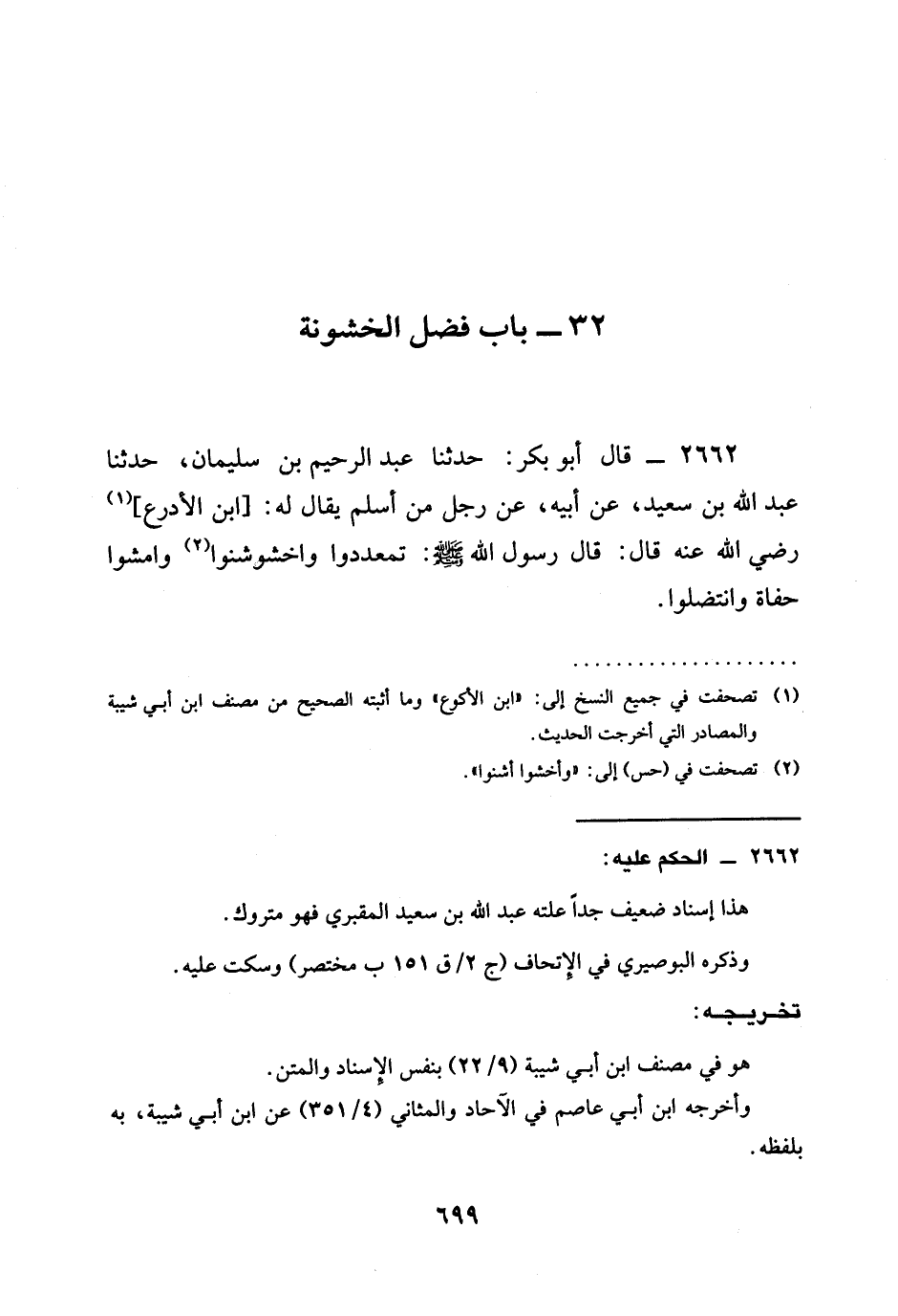 2662 - قَالَ أَبُو بَكْرٍ: حَدَّثَنَا عَبْدُ الرَّحِيمِ بْنُ سُلَيْمَانَ، حَدَّثَنَا عَبْدُ اللَّهِ بْنُ سَعِيدٍ، عَنْ أَبِيهِ، عَنْ رَجُلٍ مِنْ أَسْلَمَ يُقَالُ لَهُ: [ابْنُ الْأَدْرَعِ] رَضِيَ الله عَنْهُ قَالَ: قَالَ رَسُولُ اللَّهِ صَلَّى اللَّهُ عَلَيْهِ وَسَلَّمَ: §تَمَعْدَدُوا وَاخْشَوْشِنُوا وَامْشُوا حُفَاةً وَانْتَضِلُوا.