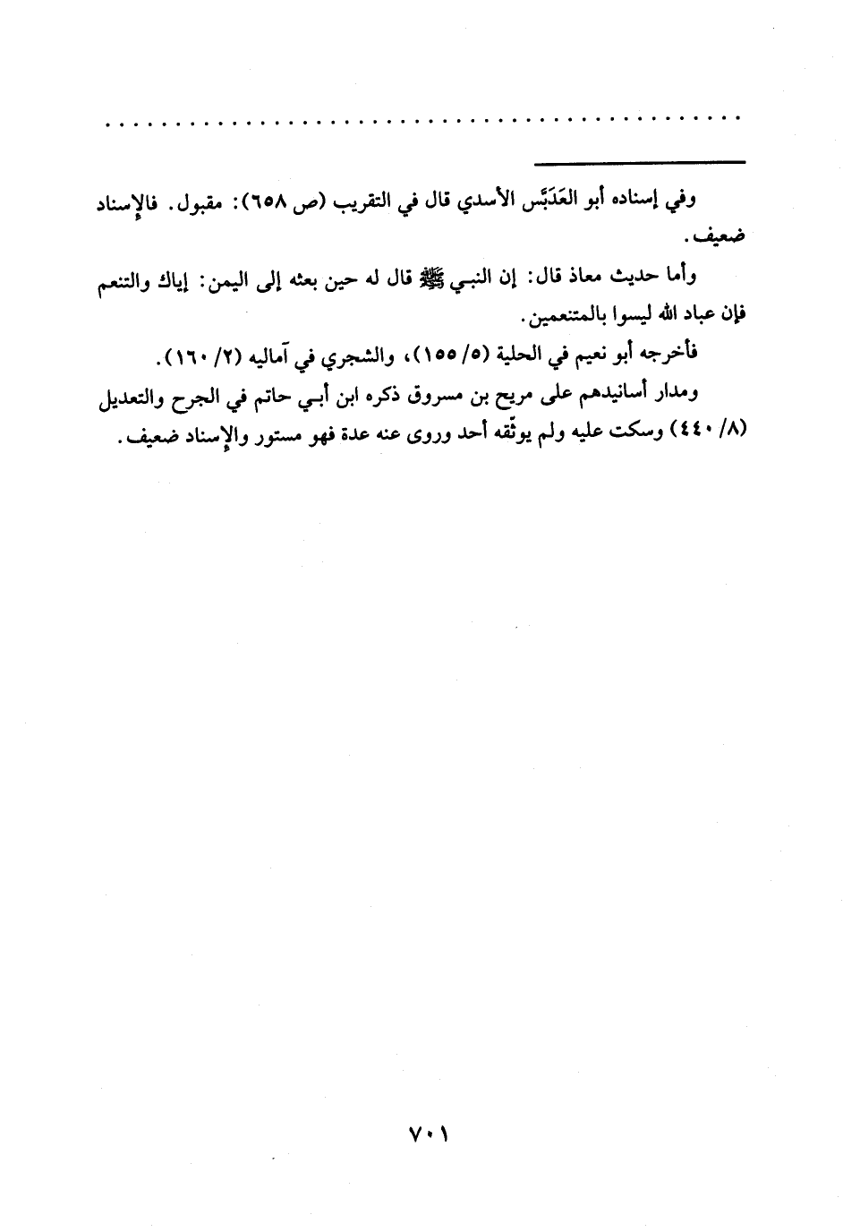 وأما حديث معاذ قَالَ: إِنَّ النَّبِيَّ -صَلَّى اللَّهُ عَلَيْهِ وَسَلَّمَ- قال له حين بعثه إلى اليمن: إياك والتنعم فإن عباد الله ليسوا بالمتنعمين.