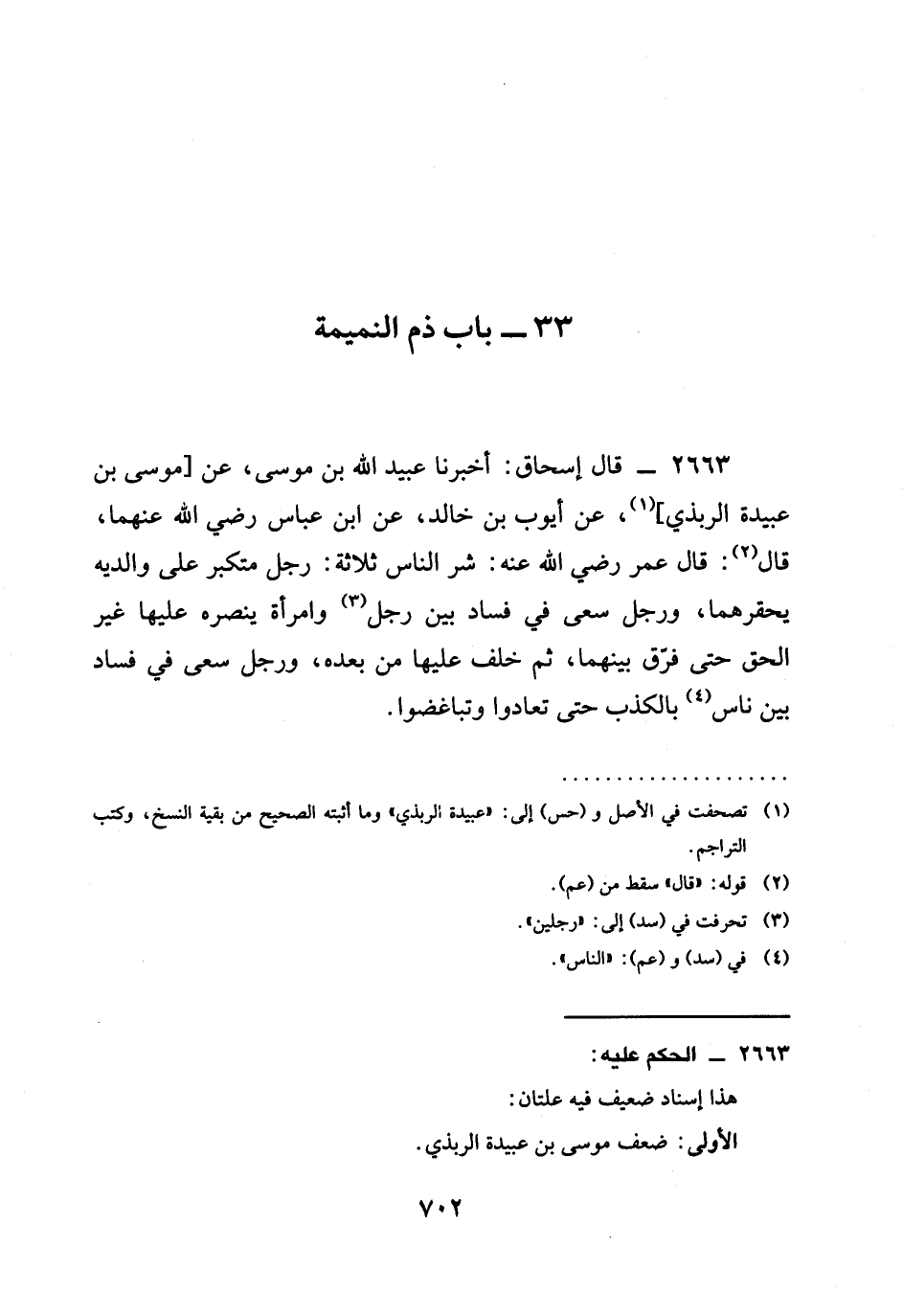 2663 - قَالَ إِسْحَاقُ: أَخْبَرَنَا عُبَيْدُ اللَّهِ بْنُ مُوسَى، عَنْ [مُوسَى بْنِ عُبَيْدَةَ الرَّبَذِيِّ] ، عَنْ أَيُّوبَ بْنِ خَالِدٍ، عَنِ ابْنِ عَبَّاسٍ رَضِيَ الله عَنْهُمَا، قَالَ: قَالَ عُمَرُ رَضِيَ الله عَنْهُ: §شَرُّ النَّاسِ ثَلَاثَةٌ: رَجُلٌ مُتَكَبِّرٌ عَلَى وَالِدَيْهِ يُحَقِّرُهُمَا، وَرَجُلٌ سَعَى فِي فَسَادٍ بَيْنَ رَجُلٍ وَامْرَأَةٍ يَنْصُرُهُ عَلَيْهَا غَيْرَ الْحَقِّ حَتَّى فَرَّقَ بَيْنَهُمَا، ثُمَّ خَلَفَ عَلَيْهَا مِنْ بَعْدِهِ، وَرَجُلٌ سَعَى فِي فساد بين ناس بِالْكَذِبِ حَتَّى تَعَادَوْا وَتَبَاغَضُوا.