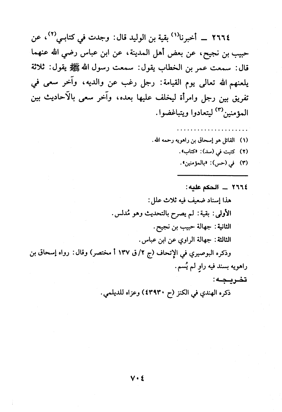 2664 - أَخْبَرَنَا بَقِيَّةُ بْنُ الْوَلِيدِ قَالَ: وَجَدْتُ فِي كِتَابِي، عَنْ حَبِيبِ بْنِ نَجِيحٍ، عَنْ بَعْضِ أَهْلِ الْمَدِينَةِ، عَنِ ابْنِ عَبَّاسٍ رَضِيَ الله عَنْهُمَا قَالَ: سَمِعْتُ عُمَرَ بْنَ الْخَطَّابِ يَقُولُ: سَمِعْتُ رَسُولَ اللَّهِ صَلَّى اللَّهُ عَلَيْهِ وَسَلَّمَ يَقُولُ: §ثَلَاثَةٌ يَلْعَنُهُمُ اللَّهُ تَعَالَى يَوْمَ الْقِيَامَةِ: رَجُلٌ رَغِبَ عَنْ وَالِدَيْهِ، وَآخَرُ سَعَى فِي تَفْرِيقٍ بَيْنَ رَجُلٍ وَامْرَأَةٍ لِيَخَلُفَ عَلَيْهَا بَعْدَهُ، وَآخَرُ سَعَى بِالْأَحَادِيثِ بَيْنَ الْمُؤْمِنِينَ لِيَتَعَادَوْا وَيَتَبَاغَضُوا.
