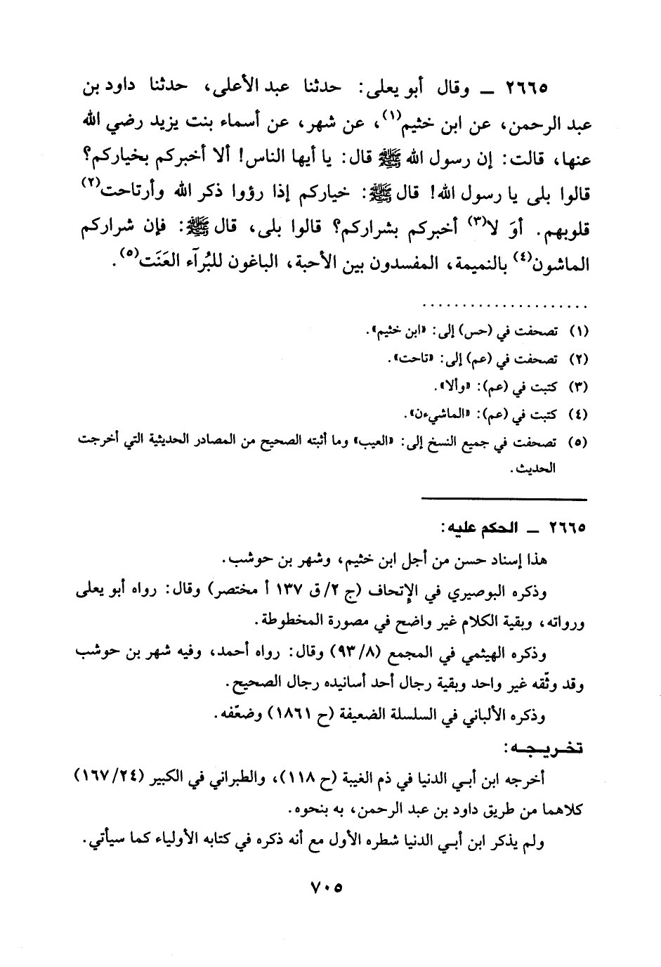 2665 - وَقَالَ أَبُو يَعْلَى: حَدَّثَنَا عَبْدُ الْأَعْلَى، حَدَّثَنَا دَاوُدُ بْنُ عَبْدِ الرَّحْمَنِ، عَنِ ابْنِ خُثَيْمٍ، عَنْ شَهْرٍ، عَنْ أَسْمَاءَ بِنْتِ يَزِيدَ رَضِيَ الله عَنْهَا، قَالَتْ: إنَّ رَسُولَ اللَّهِ صَلَّى اللَّهُ عَلَيْهِ وَسَلَّمَ قَالَ: يَا أَيُّهَا النَّاسُ! أَلَا أُخْبِرُكُمْ بِخِيَارِكُمْ؟ قَالُوا بَلَى يَا رَسُولَ اللَّهِ! قَالَ صَلَّى اللَّهُ عَلَيْهِ وَسَلَّمَ: §خِيَارُكُمْ إِذَا رُؤُوا ذُكِرَ اللَّهُ وأرتاحت قلوبهم. أو لا أُخْبِرُكُمْ بِشِرَارِكُمْ؟ قَالُوا بَلَى، قَالَ صَلَّى اللَّهُ عَلَيْهِ وَسَلَّمَ: فَإِنَّ شِرَارَكُمُ الْمَاشُونَ بِالنَّمِيمَةِ، الْمُفْسِدُونَ بَيْنَ الْأَحِبَّةِ، الْبَاغُونَ لِلْبُرآءِ الْعَنَتَ.