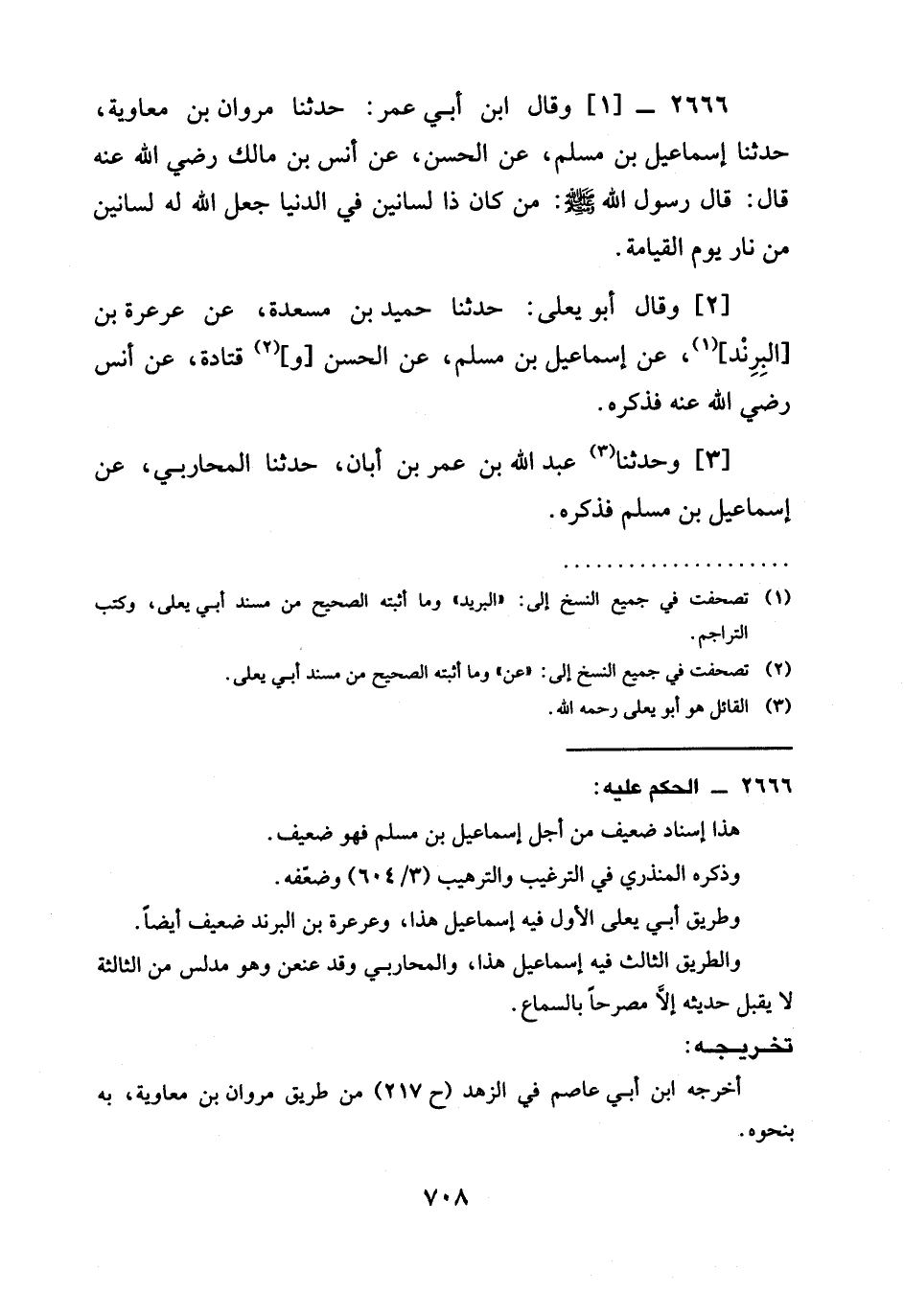 2666 -[1] وَقَالَ ابْنُ أَبِي عُمَرَ: حَدَّثَنَا مَرْوَانُ بْنُ مُعَاوِيَةَ، حَدَّثَنَا إِسْمَاعِيلُ بْنُ مُسْلِمٍ، عَنِ الْحَسَنِ، عَنْ أَنَسِ بْنِ مَالِكٍ رَضِيَ الله عَنْهُ قَالَ: قَالَ رَسُولُ اللَّهِ صَلَّى اللَّهُ عَلَيْهِ وَسَلَّمَ: §مَنْ كَانَ ذَا لِسَانَيْنِ فِي الدُّنْيَا جَعَلَ اللَّهُ لَهُ لِسَانَيْنِ مِنْ نَارٍ يَوْمَ الْقِيَامَةِ.