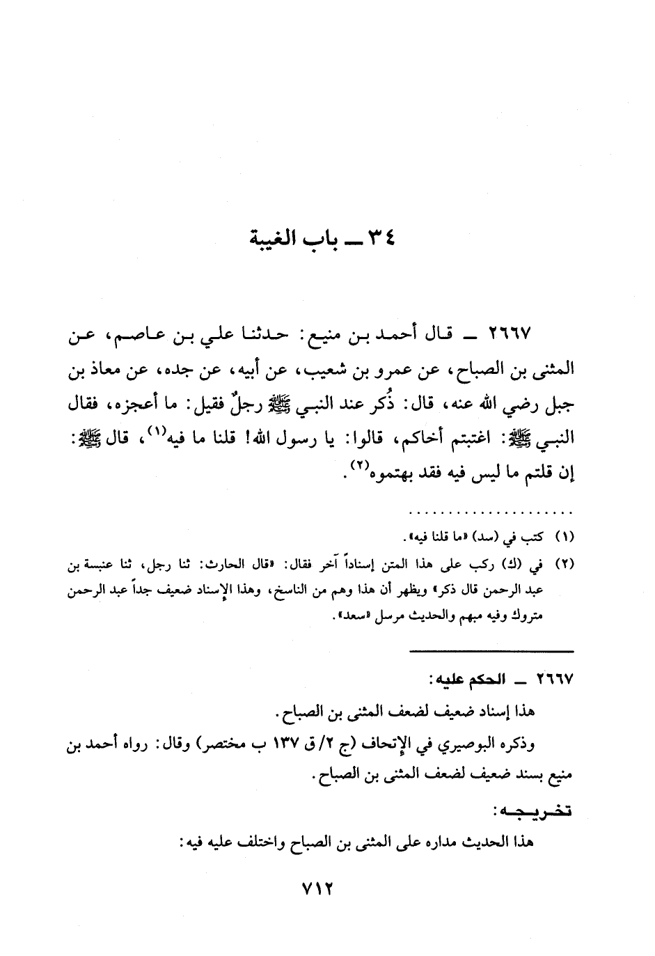 2667 - قَالَ أَحْمَدُ بْنُ مَنِيعٍ: حَدَّثَنَا عَلِيُّ بْنُ عَاصِمٍ، عَنِ الْمُثَنَّى بْنُ الصَّبَّاحِ، عَنْ عَمْرِو بْنِ شُعَيْبٍ، عَنْ أَبِيهِ، عَنْ جَدِّهِ، عَنْ مُعَاذِ بْنِ جَبَلٍ رَضِيَ الله عَنْهُ، قَالَ: ذُكِرَ عِنْدَ النَّبِيِّ صَلَّى اللَّهُ عَلَيْهِ وَسَلَّمَ رَجُلٌ فَقِيلَ: مَا أَعْجَزَهُ، فَقَالَ النَّبِيِّ صَلَّى اللَّهُ عَلَيْهِ وَسَلَّمَ: §اغْتَبْتُمْ أَخَاكُمْ، قَالُوا: يَا رَسُولَ اللَّهِ! قُلْنَا مَا فِيهِ، قَالَ صَلَّى اللَّهُ عَلَيْهِ وَسَلَّمَ: إِنْ قُلْتُمْ مَا لَيْسَ فِيهِ فَقَدْ بَهَتُّمُوهُ.