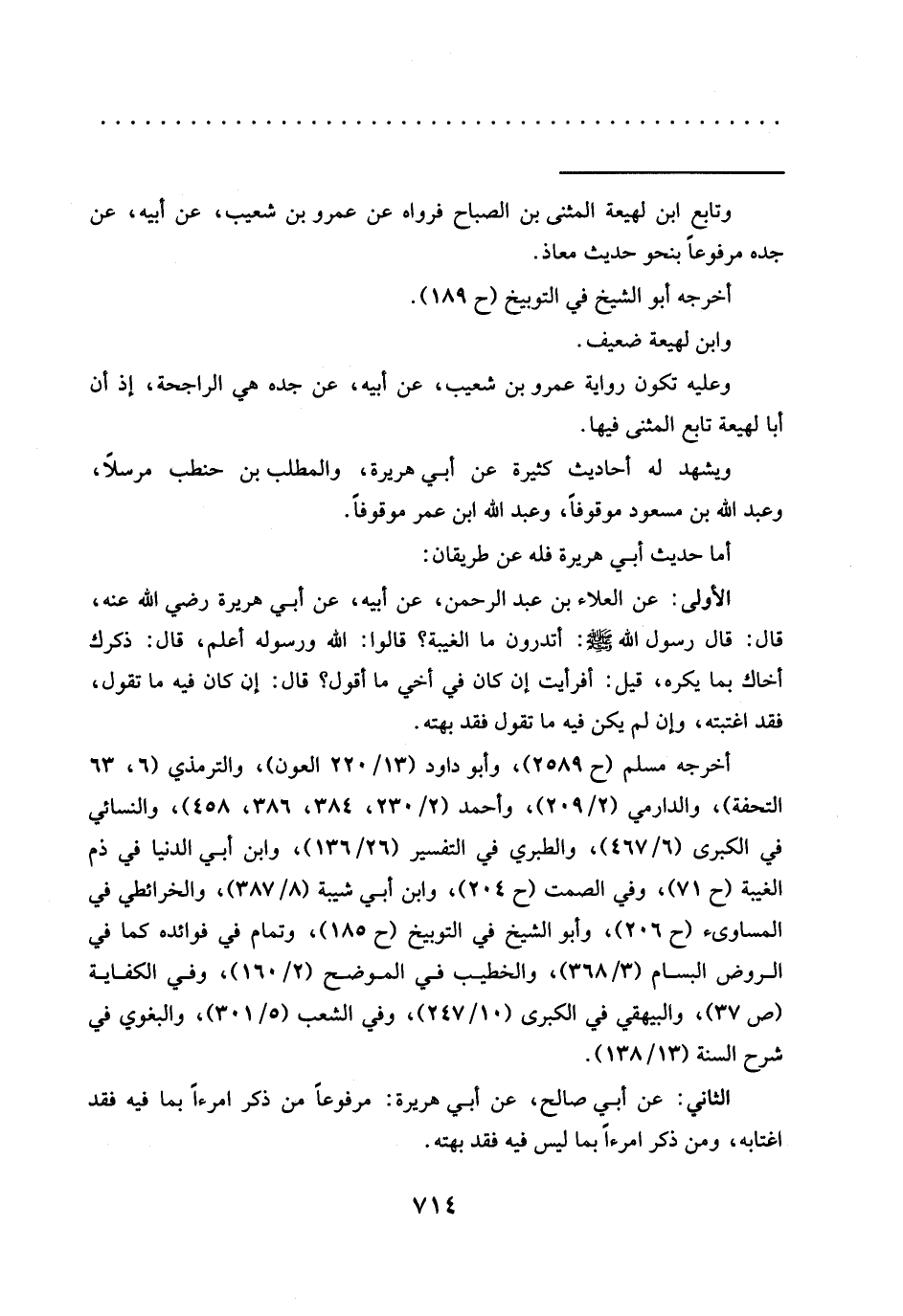 الثاني: عن أبي صالح، عن أبي هريرة: مرفوعًا من ذكر إمرءًا بما فيه فقد اغتابه، ومن ذكر امرءًا بما ليس فيه فقد بهته. =