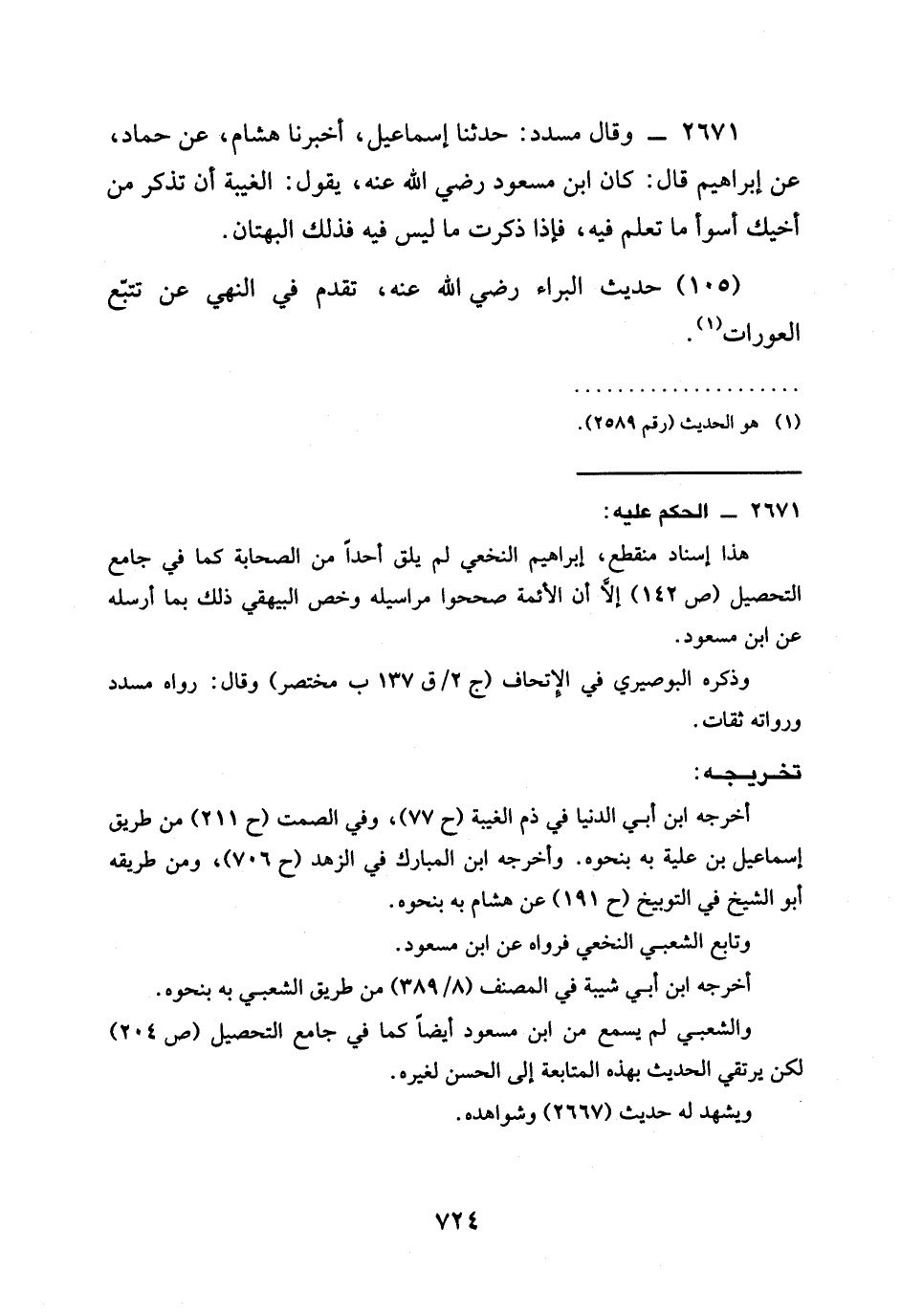 2671 - وَقَالَ مُسَدَّدٌ: حَدَّثَنَا إِسْمَاعِيلُ، أَخْبَرَنَا هِشَامٌ، عَنْ حَمَّادٍ، عَنْ إِبْرَاهِيمَ قَالَ: كَانَ ابْنُ مَسْعُودٍ رَضِيَ الله عَنْهُ، يَقُولُ: §الْغِيبَةُ أَنْ تَذْكُرَ مِنْ أَخِيكَ أَسْوَأَ مَا تَعْلَمُ فِيهِ، فَإِذَا ذَكَرْتَ مَا لَيْسَ فِيهِ فَذَلِكَ الْبُهْتَانُ.