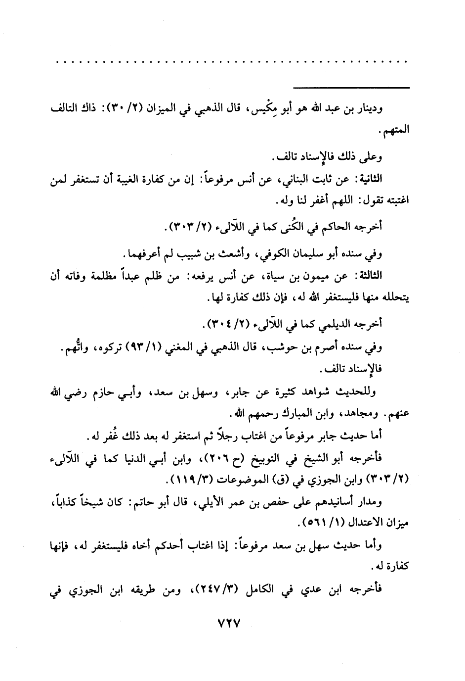 الثانية: عن ثابت البناني، عن أنس مرفوعًا: إن من كفارة الغيبة أن تستغفر لمن اغتبته تقول: اللهم اغفر لنا وله.