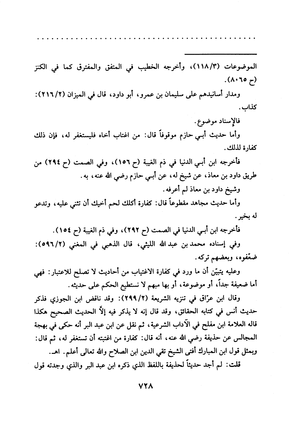 وقال ابن عرّاق في تنزيه الشريعة (2/ 299): وقد ناقض ابن الجوزي فذكر حديث أنس في كتابه الحقاثق، وقد قال إنه لا يذكر فيه إلَّا الحديث الصحيح هكذا قاله العلامة ابن مفلح في الآداب الشرعية، ثم نقل عن ابن عبد البر أنه حكى في بهجة المجالس عن حذيفة رضي الله عنه، أنه قال: كفارة من اغتبته أن تستغفر له، ثم قال: ويمثل قول ابن المبارك أفتى الشيخ تقي الدين ابن الصلاح والله تعالى أعلم. اهـ.