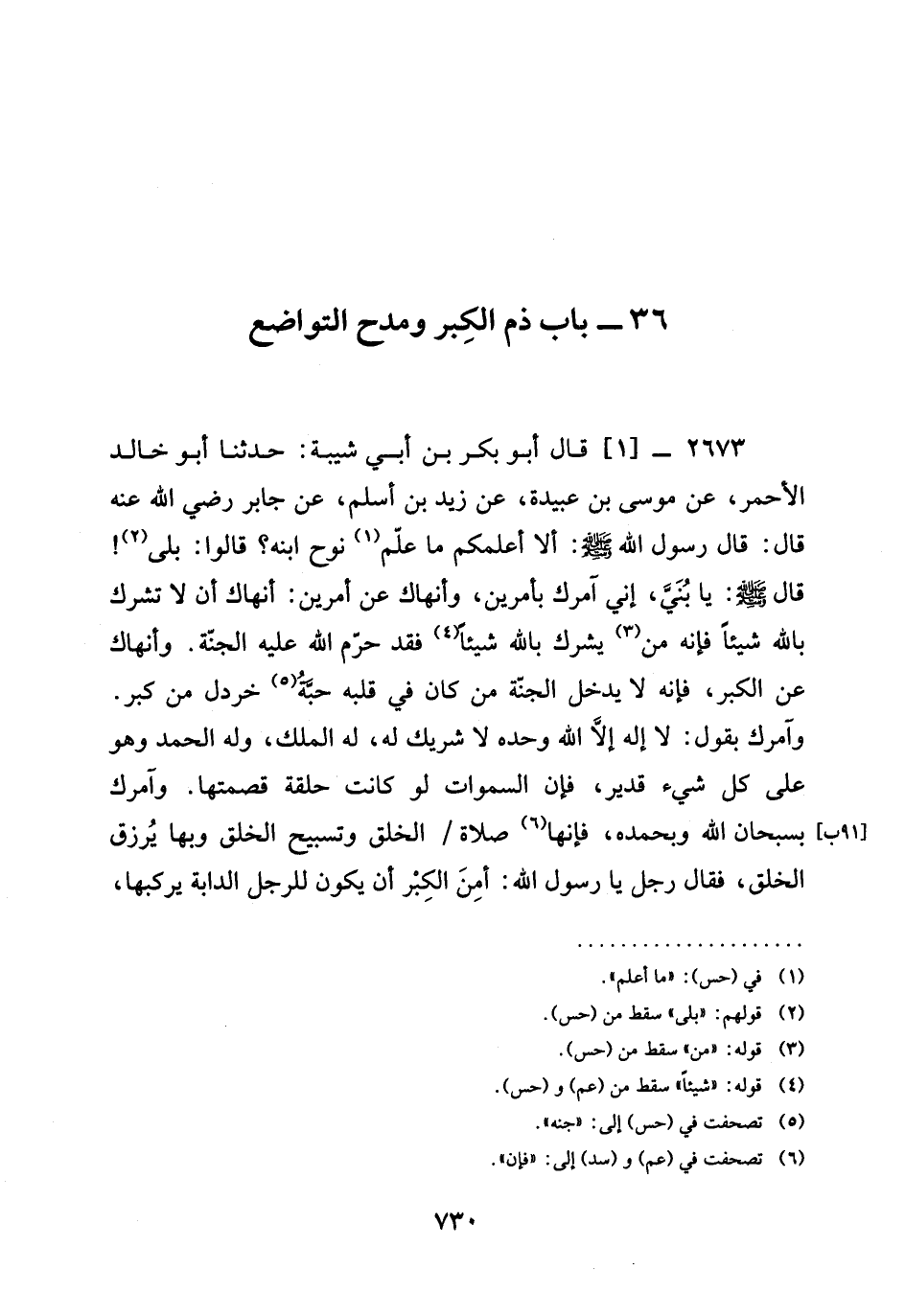 2673 -[1] قَالَ أَبُو بَكْرِ بْنُ أَبِي شَيْبَةَ: حَدَّثَنَا أَبُو خَالِدٍ الْأَحْمَرُ، عَنْ مُوسَى بْنِ عُبَيْدَةَ، عَنْ زَيْدِ بْنِ أَسْلَمَ، عَنْ جَابِرٍ رَضِيَ الله عَنْهُ قَالَ: قَالَ رَسُولُ اللَّهِ صَلَّى اللَّهُ عَلَيْهِ وَسَلَّمَ: أَلَا أُعَلِّمُكُمْ مَا عَلَّمَ نُوحٌ ابْنَهُ؟ قَالُوا: بَلَى! قَالَ صَلَّى اللَّهُ عَلَيْهِ وَسَلَّمَ: يَا بُنَيَّ، إِنِّي آمُرُكَ بِأَمْرَيْنِ، وَأَنْهَاكَ عَنْ أَمْرَيْنِ: §أَنْهَاكَ أَنْ لَا تُشْرِكَ بِاللَّهِ شَيْئًا فَإِنَّهُ مَنْ يُشْرِكْ بِاللَّهِ شيئاً فَقَدْ حَرَّمَ اللَّهُ عَلَيْهِ الْجَنَّةُ. وَأَنْهَاكَ عَنِ الْكِبْرِ، فَإِنَّهُ لَا يَدْخُلُ الْجَنَّةَ مَنْ كَانَ فِي قَلْبِهِ حَبَّةُ خَرْدَلٍ مِنْ كِبْرٍ. وَآمُرُكَ بِقَوْلِ: لَا إِلَهَ إِلَّا اللَّهُ وَحْدَهُ لَا شَرِيكَ لَهُ، لَهُ الْمُلْكُ، وَلَهُ الْحَمْدُ وَهُوَ عَلَى كُلِّ شَيْءٍ قَدِيرٌ، فَإِنَّ السَّمَوَاتِ لَوْ كَانَتْ حَلْقَةٌ قَصَمَتْهَا. وَآمُرُكَ بِسُبْحَانَ اللَّهِ وَبِحَمْدِهِ، فَإِنَّهَا صَلَاةُ / الْخَلْقِ وَتَسْبِيحُ الْخَلْقِ وَبِهَا يُرْزَقُ الْخَلْقُ، فَقَالَ رَجُلٌ يَا رَسُولَ اللَّهِ: أَمِنَ الْكِبْرِ أَنْ يَكُونَ لِلَّرَجُلِ الدَّابَّةٌ يَرْكَبُهَا،