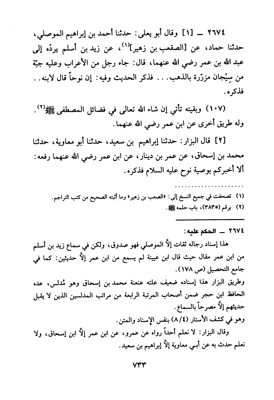 2674 - [1] وَقَالَ أَبُو يَعْلَى: حَدَّثَنَا أَحْمَدُ بْنُ إِبْرَاهِيمَ الْمَوْصِلِيُّ، حَدَّثَنَا حَمَّادٌ، عَنِ [الصَّقْعَبُ بْنِ زُهَيْرٍ] (¬1)، عَنْ زَيْدِ بْنِ أَسْلَمَ يَرُدَّهُ إِلَى عَبْدِ اللَّهِ بْنِ عُمَرَ رَضِيَ اللَّهُ عَنْهُمَا، قَالَ: جَاءَ رَجُلٌ مِنَ الْأَعْرَابِ وَعَلَيْهِ جُبَّةٌ مِنْ سِيْجان مُزَرَّرَةٌ بِالذَّهَبِ ... فَذَكَرَ الْحَدِيثَ وَفِيهِ: إِنَّ نُوحًا قَالَ لِابْنِهِ .. فَذَكَرَهُ.