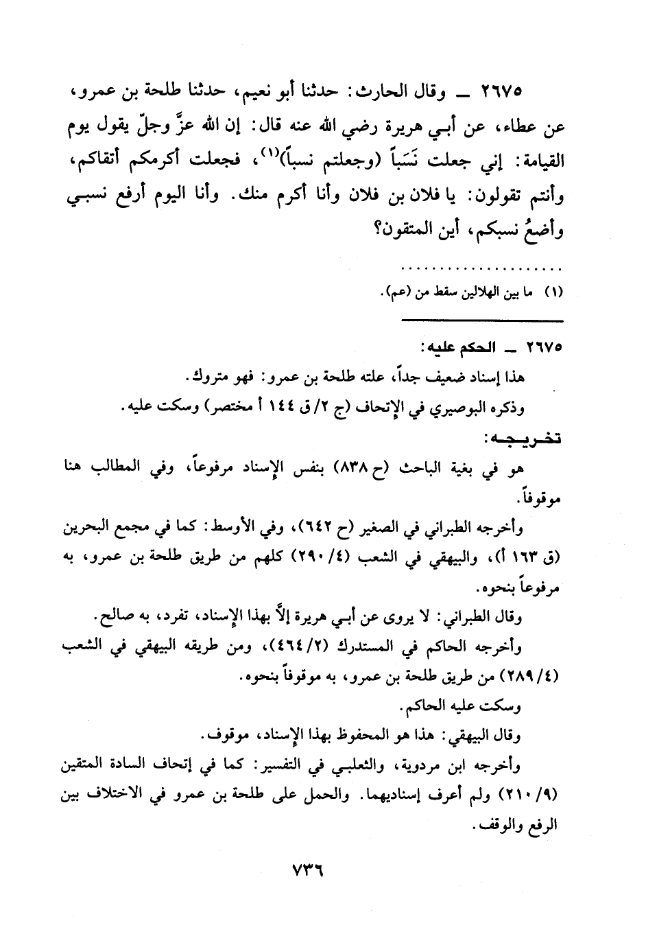 2675 - وَقَالَ الْحَارِثُ: حَدَّثَنَا أَبُو نُعَيْمٍ، حَدَّثَنَا طَلْحَةُ بْنُ عَمْرٍو، عَنْ عَطَاءٍ، عَنْ أَبِي هُرَيْرَةَ رَضِيَ الله عَنْهُ قَالَ: إِنَّ اللَّهَ عَزَّ وَجَلَّ يَقُولُ يَوْمَ الْقِيَامَةِ: §إِنِّي جَعَلْتُ نَسَبًا (وَجَعَلْتُمْ نَسَبًا) ، فَجَعَلْتُ أَكْرَمَكُمْ أَتْقَاكُمْ، وَأَنْتُمْ تَقُولُونَ: يَا فُلَانُ بْنَ فُلَانٍ وَأَنَا أَكْرَمُ مِنْكَ. وَأَنَا الْيَوْمَ أَرْفَعُ نَسَبِي وَأَضَعُ نَسَبَكُمْ، أَيْنَ الْمُتَّقُونَ؟