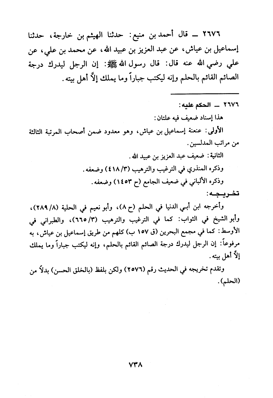 2676 - قَالَ أَحْمَدُ بْنُ مَنِيعٍ: حَدَّثَنَا الْهَيْثَمُ بْنُ خَارِجَةَ، حَدَّثَنَا إِسْمَاعِيلُ بْنُ عَيَّاشٍ، عَنْ عَبْدِ الْعَزِيزِ بْنِ عُبَيْدِ اللَّهِ، عَنْ مُحَمَّدِ بْنِ عَلِيٍّ، عَنْ عَلِيٍّ رَضِيَ الله عَنْهُ قَالَ: قَالَ رَسُولُ اللَّهِ صَلَّى اللَّهُ عَلَيْهِ وَسَلَّمَ: إِنَّ §الرَّجُلَ لَيُدْرِكُ دَرَجَةَ الصَّائِمِ الْقَائِمِ بِالْحِلْمِ وَإِنَّهُ لَيُكْتَبُ جَبَّارًا وَمَا يَمْلِكُ إِلَّا أَهْلَ بَيْتِهِ.