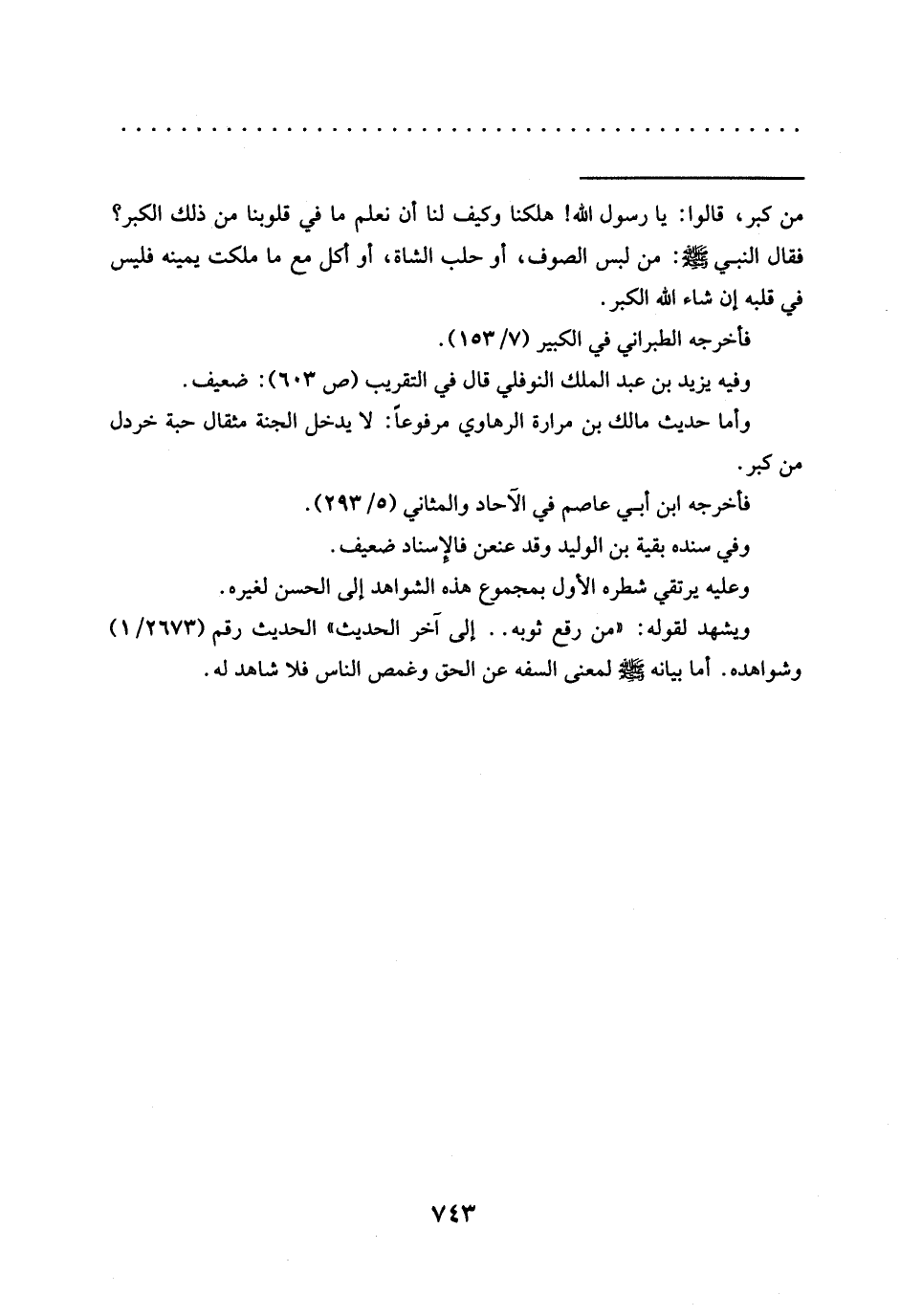 ويشهد لقوله: "من رقع ثوبه .. إلى آخر الحديث " الحديث رقم (1/ 2673) وشواهده. أما بيانه -صلى الله عليه وسلم- لمعنى السفه عن الحق وغمص الناس فلا شاهد له. =