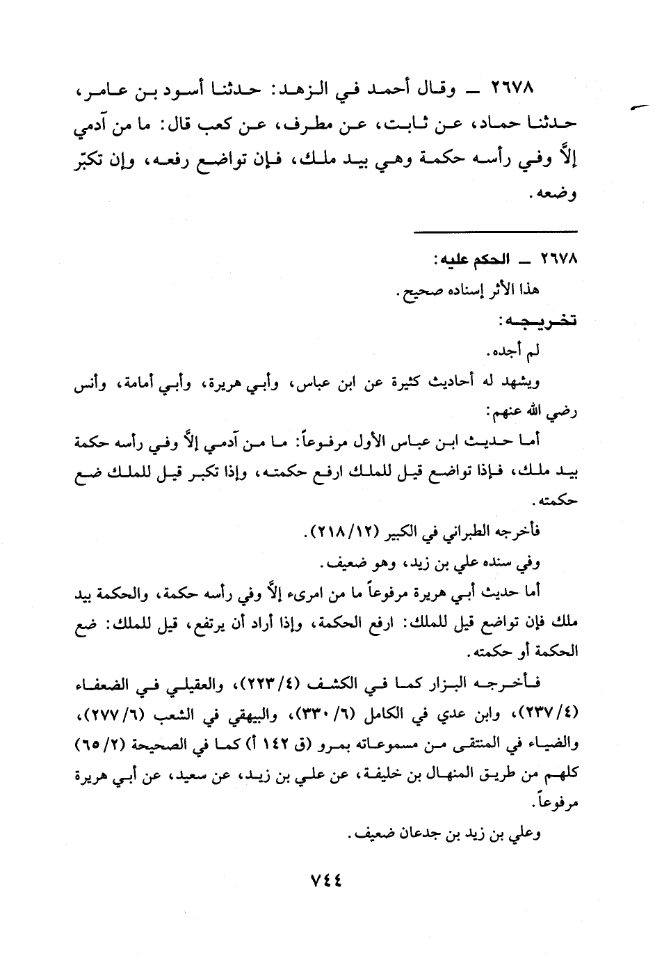 2678 - وَقَالَ أَحْمَدُ فِي الزُّهْدِ: حَدَّثَنَا أَسْوَدُ بْنُ عَامِرٍ، حَدَّثَنَا حَمَّادٌ، عَنْ ثَابِتٍ، عَنْ مُطَرِّفٍ، عَنْ كَعْبٍ قَالَ: مَا مِنْ آدَمَيٍّ إلَّا وَفِي رَأْسِهِ حِكْمَةٌ وَهِيَ بِيَدِ مَلَكٍ، فَإِنْ تواضع رفعه، وإن تكبّر وضعه.