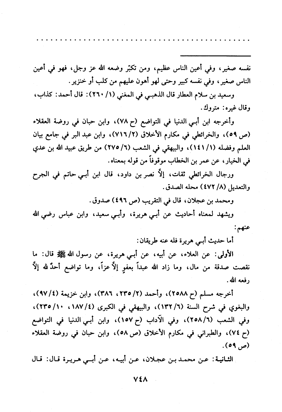 الأولى: عَنِ الْعَلَاءِ، عَنْ أَبِيهِ، عَنْ أَبِي هُرَيْرَةَ، عَنْ رَسُولِ اللَّهِ -صَلَّى اللَّهُ عَلَيْهِ وَسَلَّمَ- قال: ما نقصت صدقة من مال، وما زاد الله عبدًا بعفوٍ إلَّا عزًا، وما تواضع أحدٌ لله إلَّا رفعه الله.