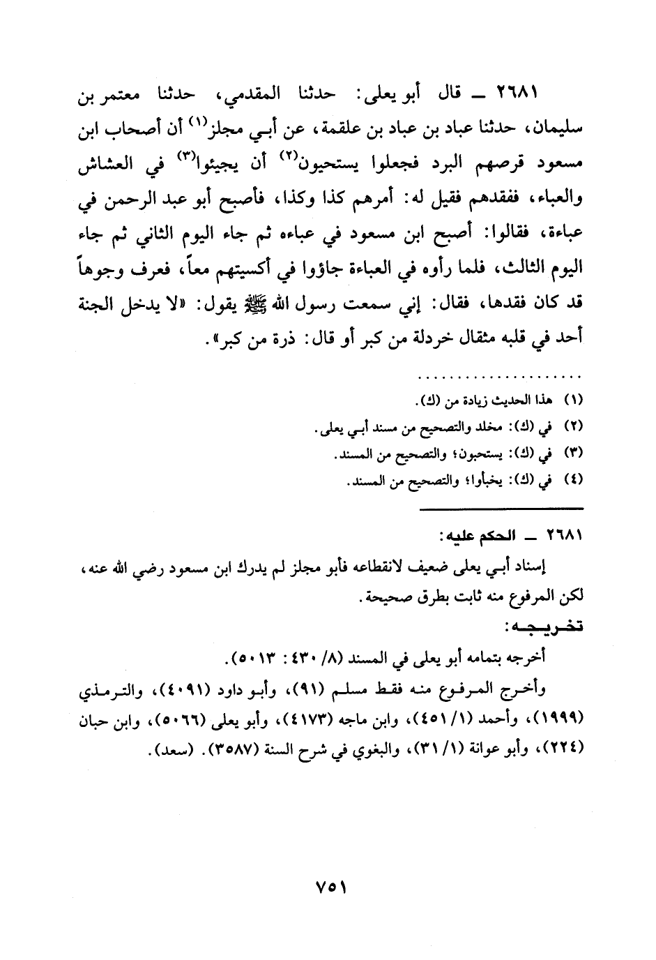 2681 - قَالَ أَبُو يَعْلَى: حَدَّثَنَا الْمُقَدَّمِيُّ، حَدَّثَنَا مُعْتَمِرُ بْنُ سُلَيْمَانَ، حَدَّثَنَا عَبَّادُ بْنُ عَبَّادِ بْنِ عَلْقَمَةَ، عَنْ أَبِي مِجْلَزٍ أَنَّ أَصْحَابَ ابْنَ مَسْعُودٍ قَرَصَهُمُ الْبَرْدُ فَجَعَلُوا يَسْتَحْيُونَ أَنْ يَجِيئُوا فِي الْعَشَاشِ وَالْعَبَاءِ، فَفَقَدَهُمْ فَقِيلَ لَهُ: أَمْرُهُمْ كَذَا وَكَذَا، فَأَصْبَحَ أَبُو عَبْدِ الرَّحْمَنِ فِي عَبَاءَةٍ، فَقَالُوا: أَصْبَحَ ابْنُ مَسْعُودٍ فِي عَبَاءَةٍ ثُمَّ جَاءَ الْيَوْمُ الثَّانِي ثُمَّ جَاءَ الْيَوْمُ الثَّالِثُ، فَلَمَّا رَأَوْهُ في العباءة جاؤوا فِي أَكْسِيَتِهِمْ مَعًا، فَعَرَفَ وُجُوهًا قَدْ كَانَ فَقَدَهَا، فَقَالَ: إِنِّي سَمِعْتُ رَسُولَ اللَّهِ صَلَّى اللَّهُ عَلَيْهِ وَسَلَّمَ يَقُولُ: " §لَا يَدْخُلُ الْجَنَّةَ أَحَدٌ فِي قَلْبِهِ مِثْقَالُ خَرْدَلَةٍ مِنْ كِبْرٍ أَوْ قَالَ: ذَرَّةٌ مِنْ كِبْرٍ ".